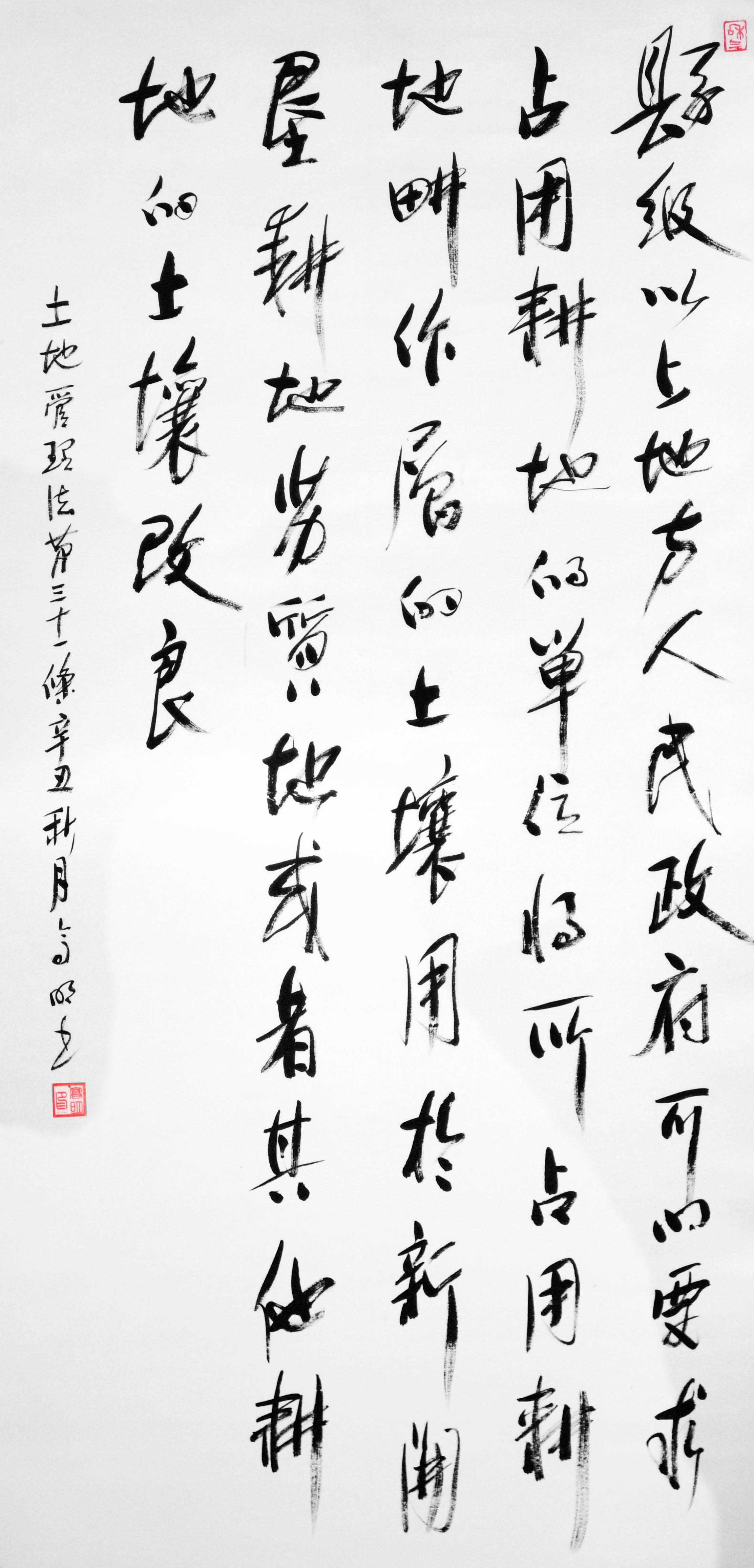 繼1600余位書(shū)法家參與書(shū)寫(xiě)《中華人民共和國(guó)民法典》全部1260條法條之后,法治日?qǐng)?bào)社聯(lián)合自然資源部法規(guī)司、自然資源部書(shū)畫(huà)研究會(huì)和北京昌平書(shū)法家協(xié)會(huì),將筆端對(duì)準(zhǔn)土地管理“一法一條例”,即《中華人民共和國(guó)土地管理法》和《中華人民共和國(guó)土地管理法實(shí)施條例》。