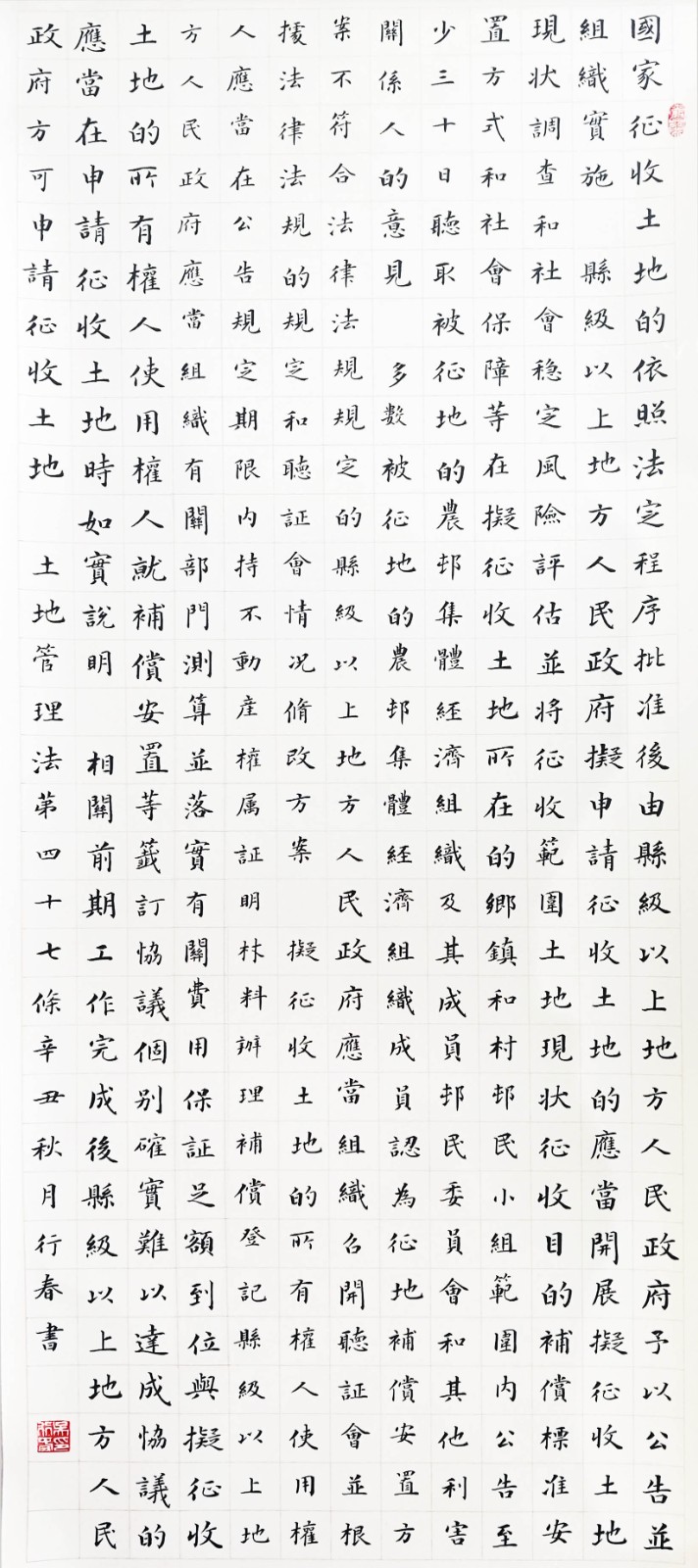繼1600余位書(shū)法家參與書(shū)寫(xiě)《中華人民共和國(guó)民法典》全部1260條法條之后,法治日?qǐng)?bào)社聯(lián)合自然資源部法規(guī)司、自然資源部書(shū)畫(huà)研究會(huì)和北京昌平書(shū)法家協(xié)會(huì),將筆端對(duì)準(zhǔn)土地管理“一法一條例”,即《中華人民共和國(guó)土地管理法》和《中華人民共和國(guó)土地管理法實(shí)施條例》。
