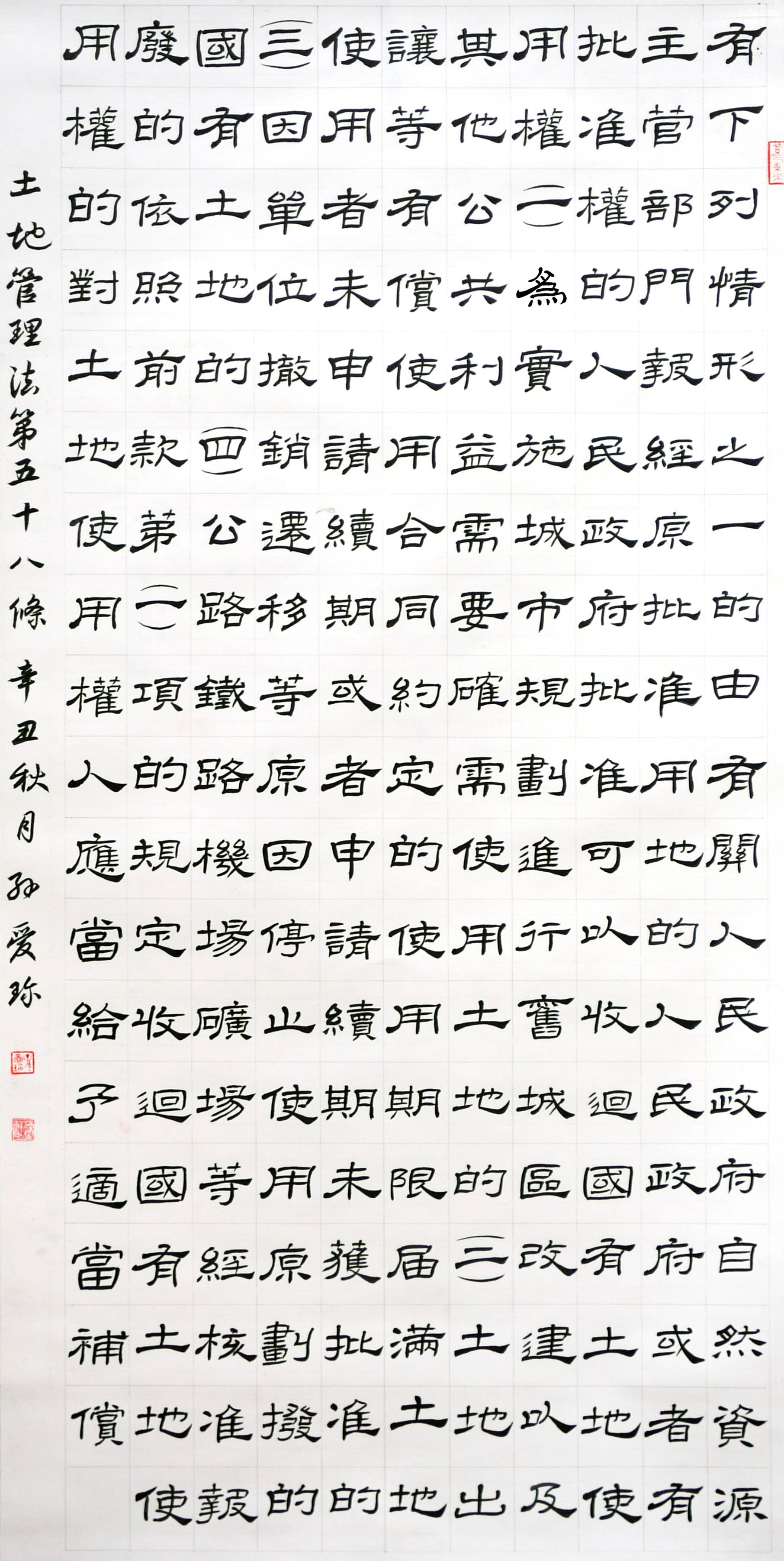 繼1600余位書(shū)法家參與書(shū)寫(xiě)《中華人民共和國(guó)民法典》全部1260條法條之后,法治日?qǐng)?bào)社聯(lián)合自然資源部法規(guī)司、自然資源部書(shū)畫(huà)研究會(huì)和北京昌平書(shū)法家協(xié)會(huì),將筆端對(duì)準(zhǔn)土地管理“一法一條例”,即《中華人民共和國(guó)土地管理法》和《中華人民共和國(guó)土地管理法實(shí)施條例》。
