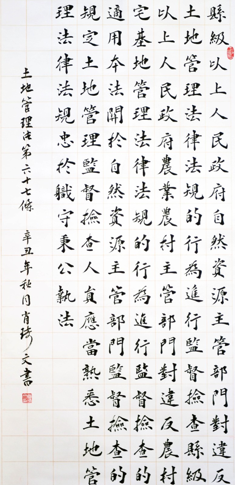 繼1600余位書法家參與書寫《中華人民共和國民法典》全部1260條法條之后,法治日報社聯(lián)合自然資源部法規(guī)司、自然資源部書畫研究會和北京昌平書法家協(xié)會,將筆端對準土地管理“一法一條例”,即《中華人民共和國土地管理法》和《中華人民共和國土地管理法實施條例》。