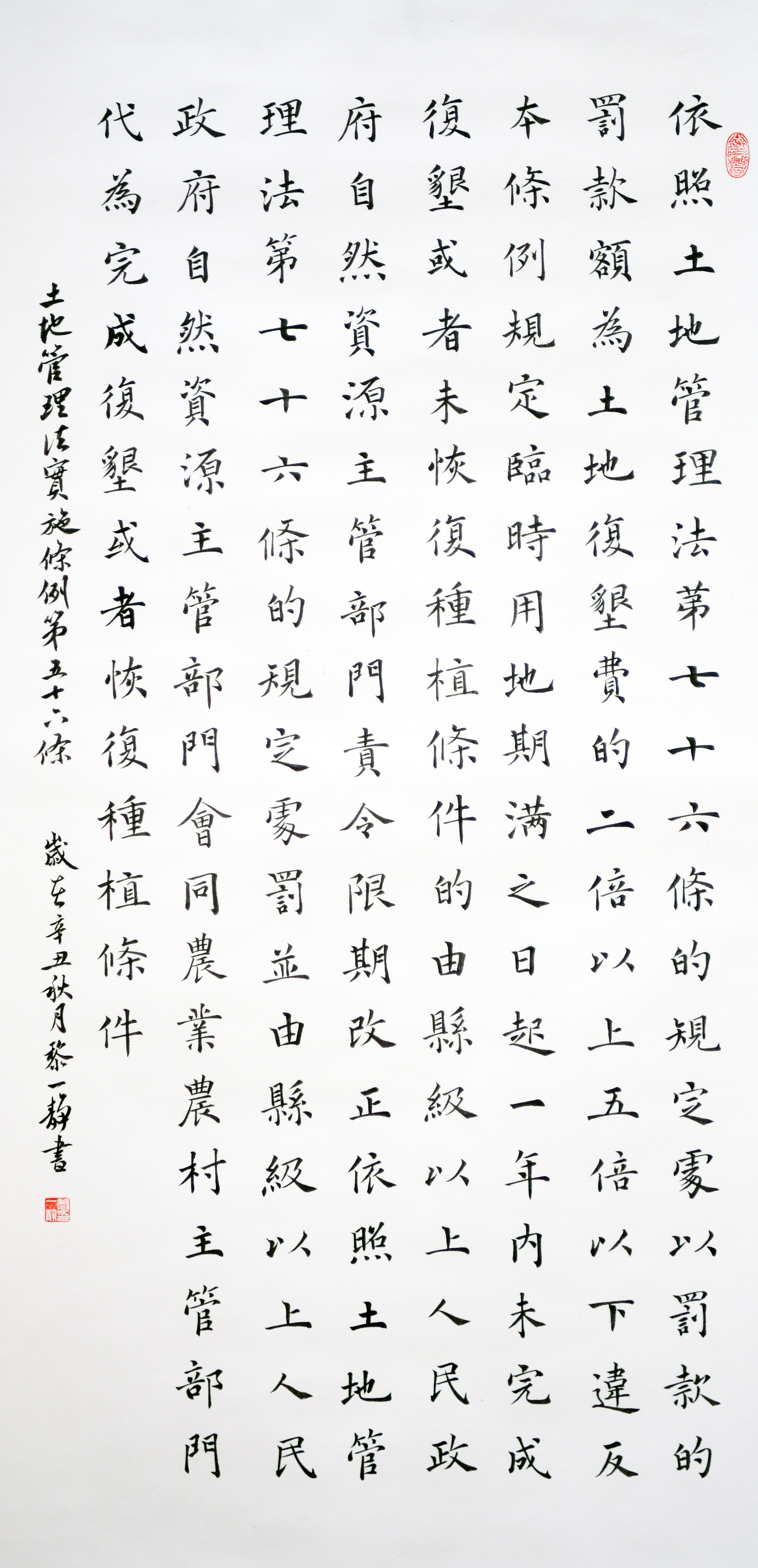 繼1600余位書法家參與書寫《中華人民共和國民法典》全部1260條法條之后,法治日報(bào)社聯(lián)合自然資源部法規(guī)司、自然資源部書畫研究會和北京昌平書法家協(xié)會,將筆端對準(zhǔn)土地管理“一法一條例”,即《中華人民共和國土地管理法》和《中華人民共和國土地管理法實(shí)施條例》。