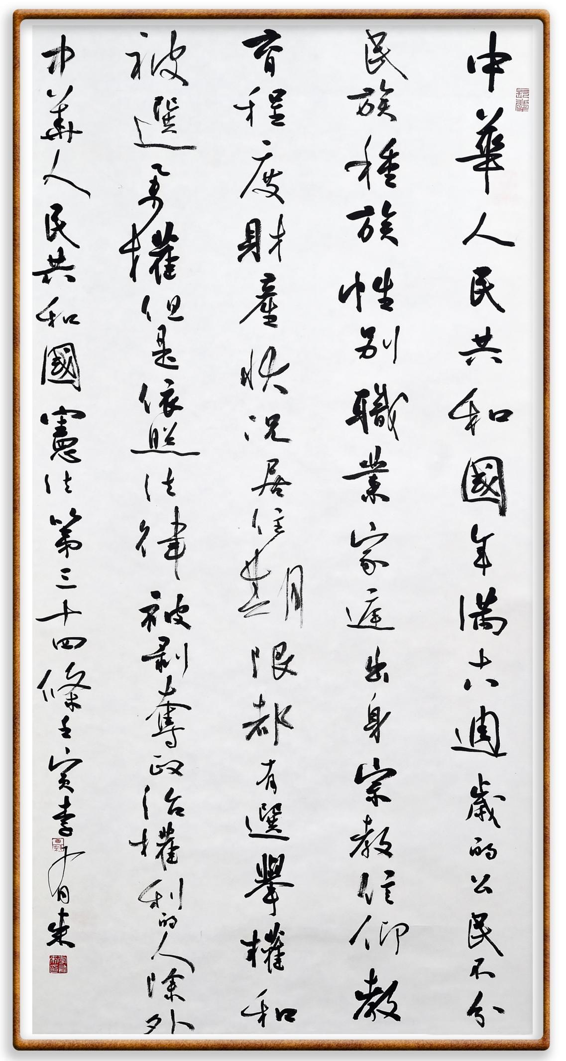 繼《中華人民共和國民法典》《中華人民共和國土地管理法》《中華人民共和國土地管理法實施條例》《中華人民共和國法律援助法》之后,法治日報社聯(lián)合北京市司法局、北京書法家協(xié)會,將筆端對準(zhǔn)《中華人民共和國憲法》和《中華人民共和國行政處罰法》。