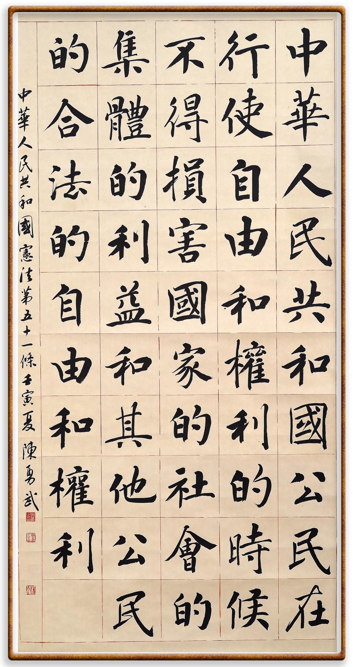 繼《中華人民共和國民法典》《中華人民共和國土地管理法》《中華人民共和國土地管理法實施條例》《中華人民共和國法律援助法》之后,法治日報社聯(lián)合北京市司法局、北京書法家協(xié)會,將筆端對準(zhǔn)《中華人民共和國憲法》和《中華人民共和國行政處罰法》。
