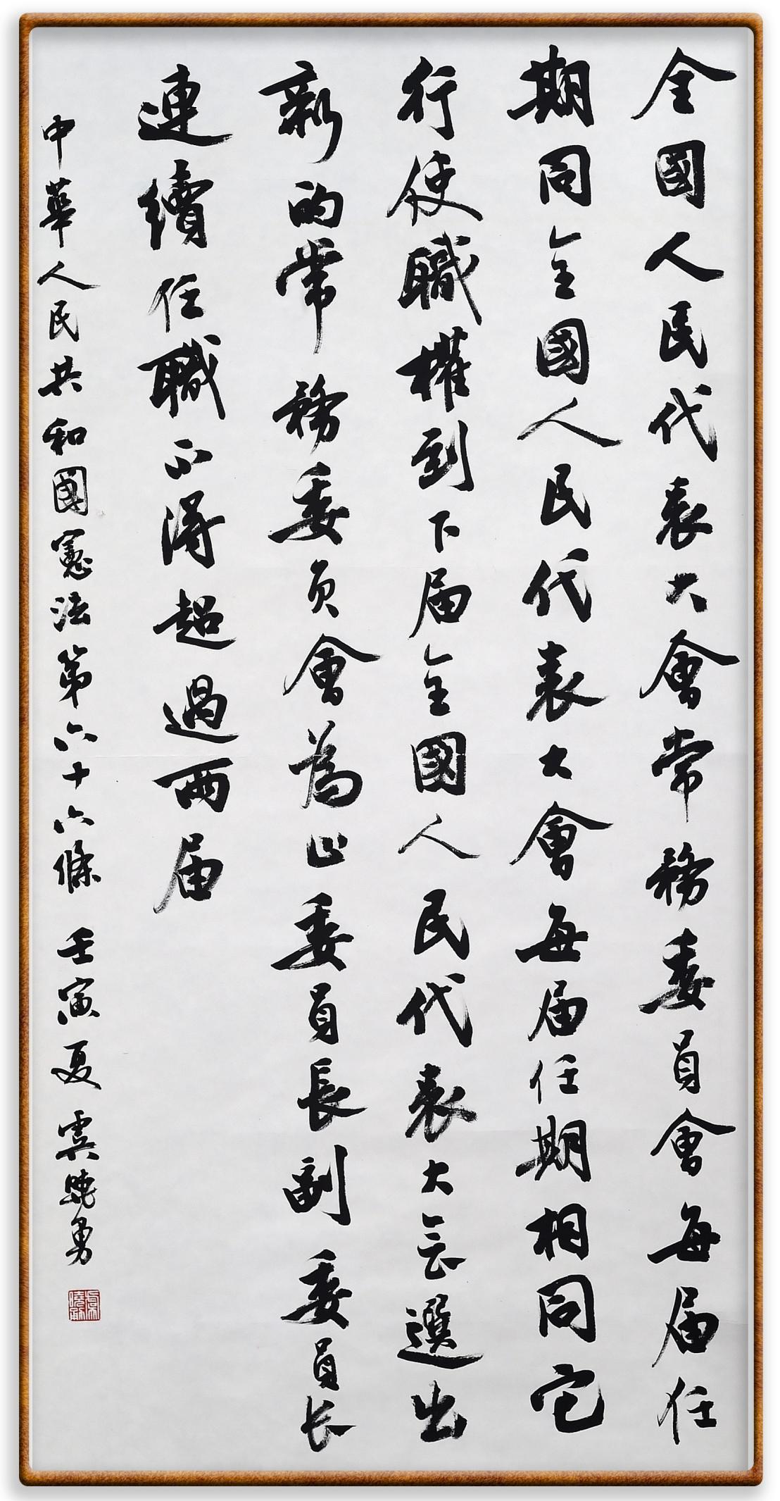 繼《中華人民共和國(guó)民法典》《中華人民共和國(guó)土地管理法》《中華人民共和國(guó)土地管理法實(shí)施條例》《中華人民共和國(guó)法律援助法》之后,法治日?qǐng)?bào)社聯(lián)合北京市司法局、北京書(shū)法家協(xié)會(huì),將筆端對(duì)準(zhǔn)《中華人民共和國(guó)憲法》和《中華人民共和國(guó)行政處罰法》。