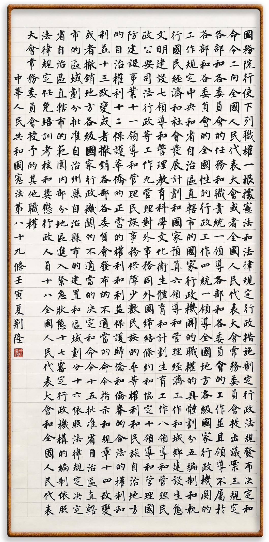 繼《中華人民共和國(guó)民法典》《中華人民共和國(guó)土地管理法》《中華人民共和國(guó)土地管理法實(shí)施條例》《中華人民共和國(guó)法律援助法》之后,法治日?qǐng)?bào)社聯(lián)合北京市司法局、北京書(shū)法家協(xié)會(huì),將筆端對(duì)準(zhǔn)《中華人民共和國(guó)憲法》和《中華人民共和國(guó)行政處罰法》。