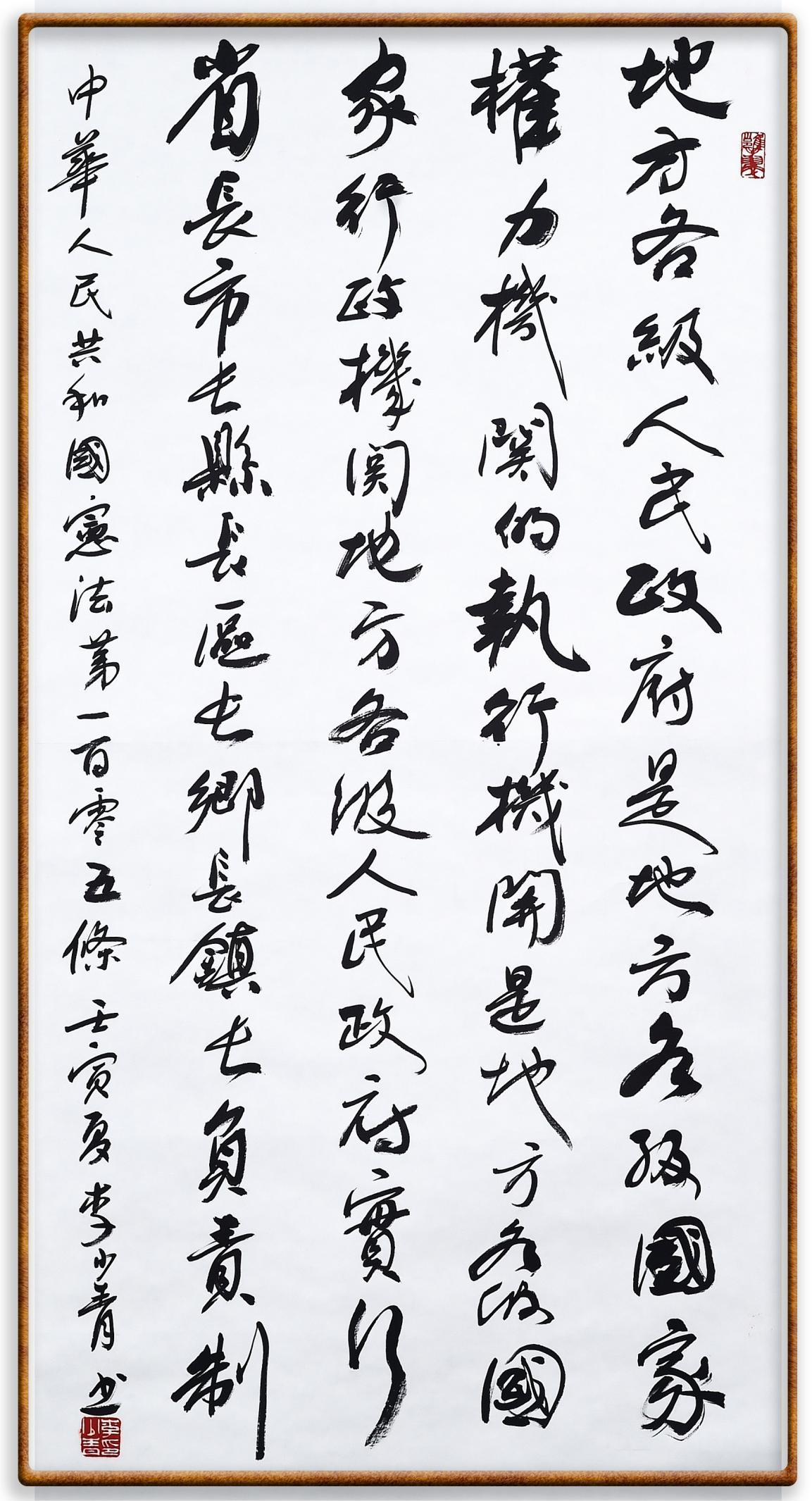 繼《中華人民共和國民法典》《中華人民共和國土地管理法》《中華人民共和國土地管理法實施條例》《中華人民共和國法律援助法》之后,法治日報社聯(lián)合北京市司法局、北京書法家協(xié)會,將筆端對準(zhǔn)《中華人民共和國憲法》和《中華人民共和國行政處罰法》。