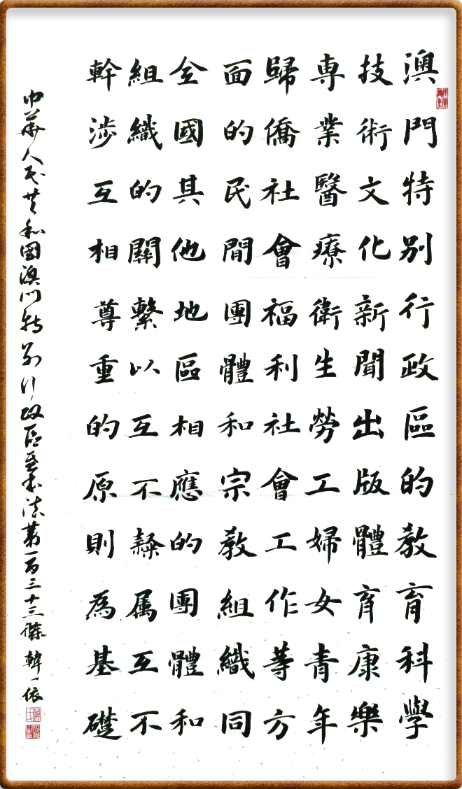 澳門基本法第一百三十三條 澳門特別行政區(qū)的教育、科學、技術、文化、新聞、出版、體育、康樂、專業(yè)、醫(yī)療衛(wèi)生、勞工、婦女、青年、歸僑、社會福利、社會工作等方面的民間團體和宗教組織同全國其他地區(qū)相應的團體和組織的關系,以互不隸屬、互不干涉、互相尊重的原則為基礎。