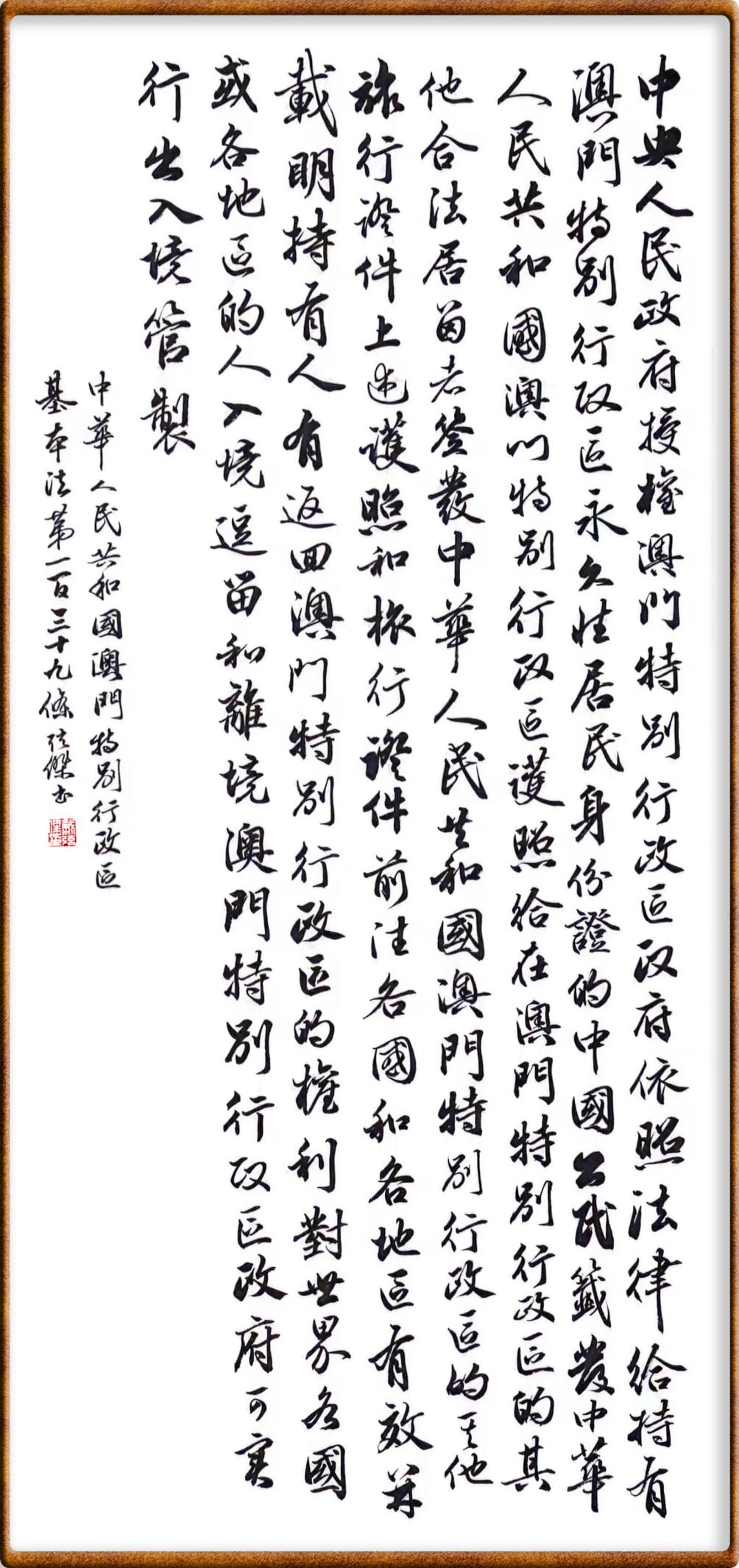 澳門基本法第一百三十九條 中央人民政府授權(quán)澳門特別行政區(qū)政府依照法律給持有澳門特別行政區(qū)永久性居民身份證的中國公民簽發(fā)中華人民共和國澳門特別行政區(qū)護照,給在澳門特別行政區(qū)的其他合法居留者簽發(fā)中華人民共和國澳門特別行政區(qū)的其他旅行證件。上述護照和旅行證件,前往各國和各地區(qū)有效,并載明持有人有返回澳門特別行政區(qū)的權(quán)利。