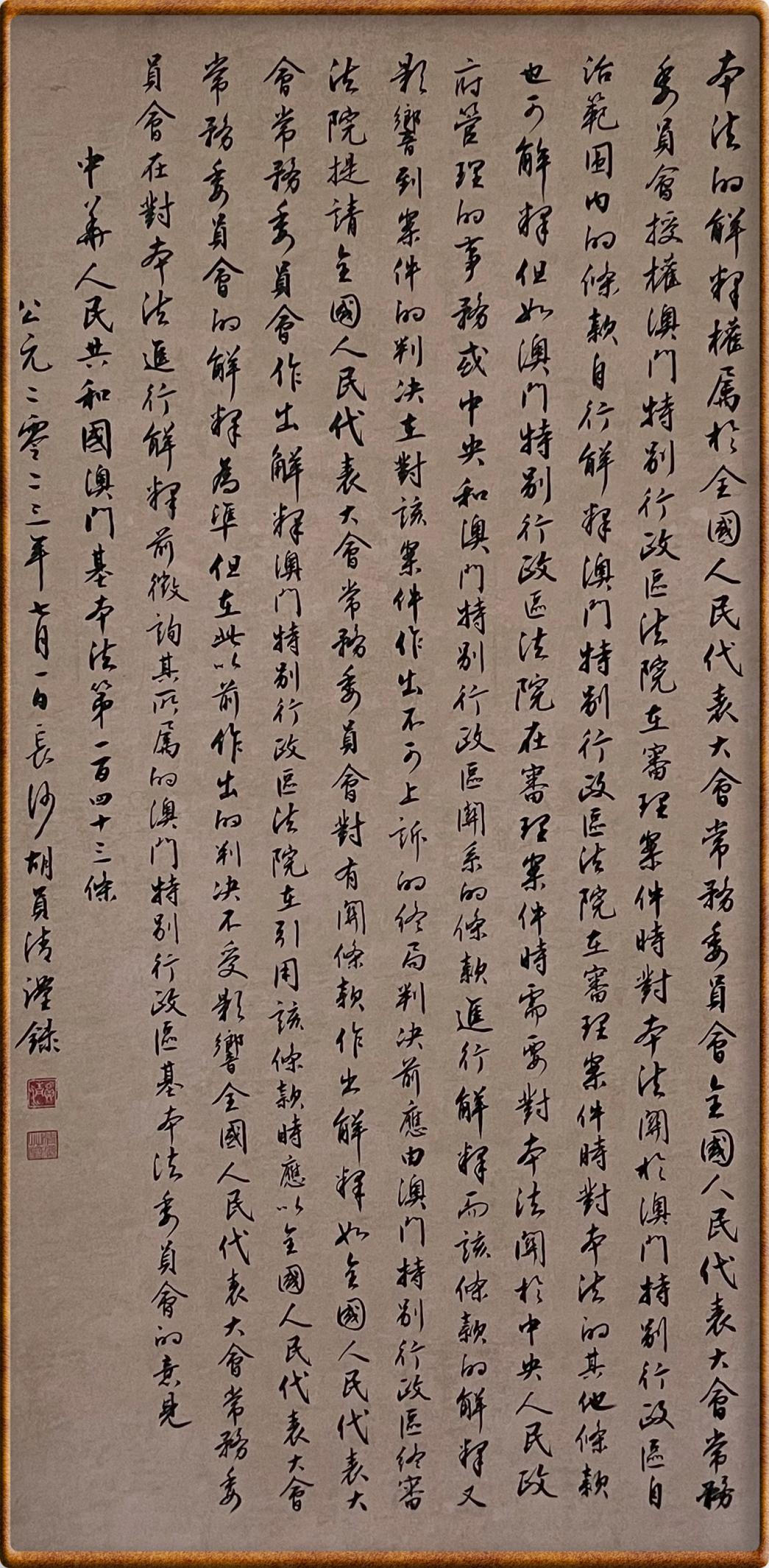 澳門基本法第一百四十三條 本法的解釋權(quán)屬于全國(guó)人民代表大會(huì)常務(wù)委員會(huì)。