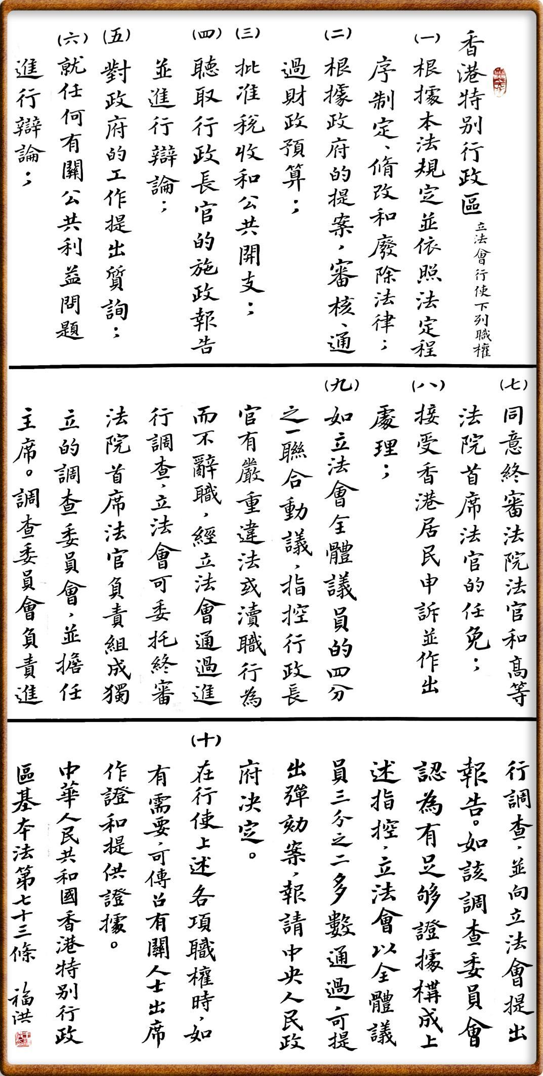 香港基本法第七十三條 香港特別行政區(qū)立法會(huì)行使下列職權(quán):
