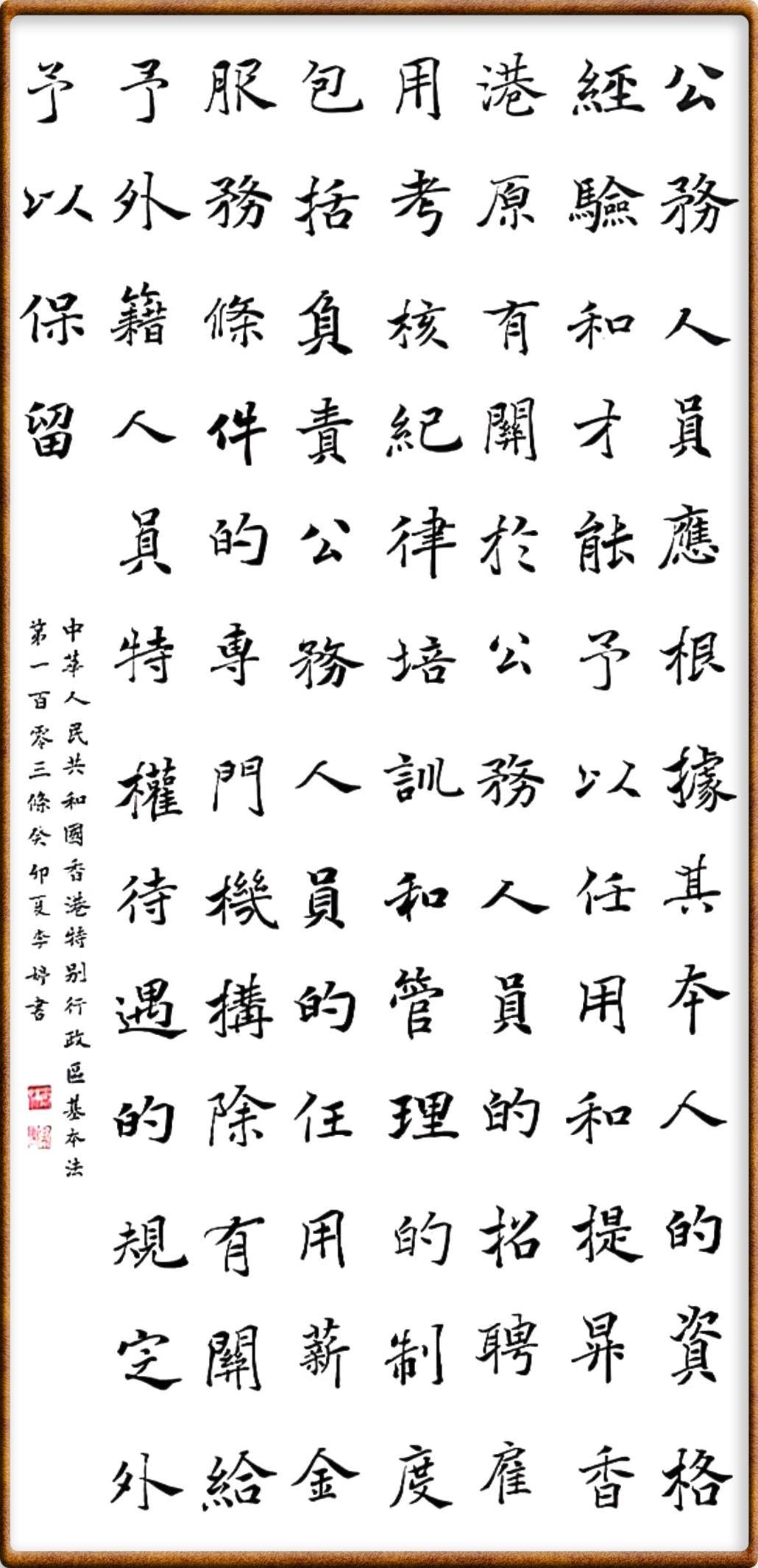 香港基本法第一百零三條 公務(wù)人員應(yīng)根據(jù)其本人的資格、經(jīng)驗(yàn)和才能予以任用和提升,香港原有關(guān)于公務(wù)人員的招聘、雇用、考核、紀(jì)律、培訓(xùn)和管理的制度,包括負(fù)責(zé)公務(wù)人員的任用、薪金、服務(wù)條件的專門(mén)機(jī)構(gòu),除有關(guān)給予外籍人員特權(quán)待遇的規(guī)定外,予以保留。