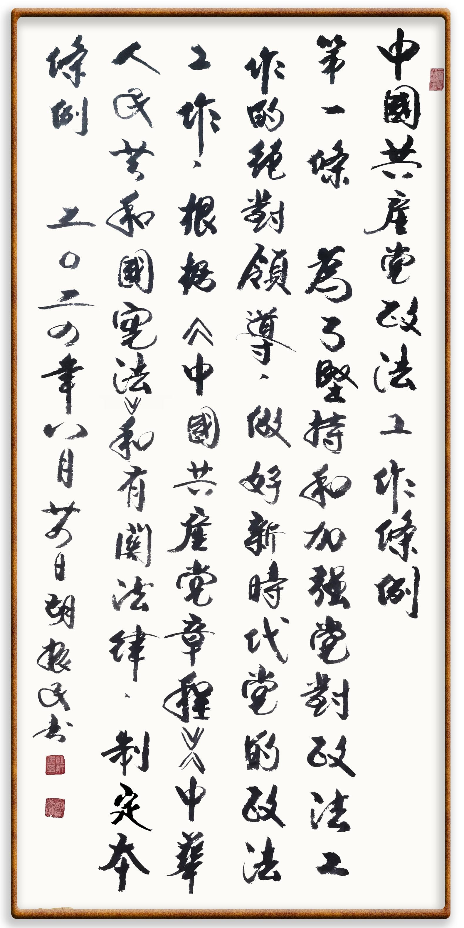 《中國共產黨政法工作條例》對黨領導新時代政法工作進行全面制度擘畫,為黨領導政法工作提供基本遵循,具有重大而深遠的意義。為學習好、宣傳好、貫徹好、實施好這部黨內法規(guī),繼《中華人民共和國民法典》《中華人民共和國憲法》《信訪工作條例》《中華人民共和國澳門特別行政區(qū)基本法》《中華人民共和國香港特別行政區(qū)基本法》等法律法規(guī)之后,“書·法”系列活動將筆端對準《中國共產黨政法工作條例》。