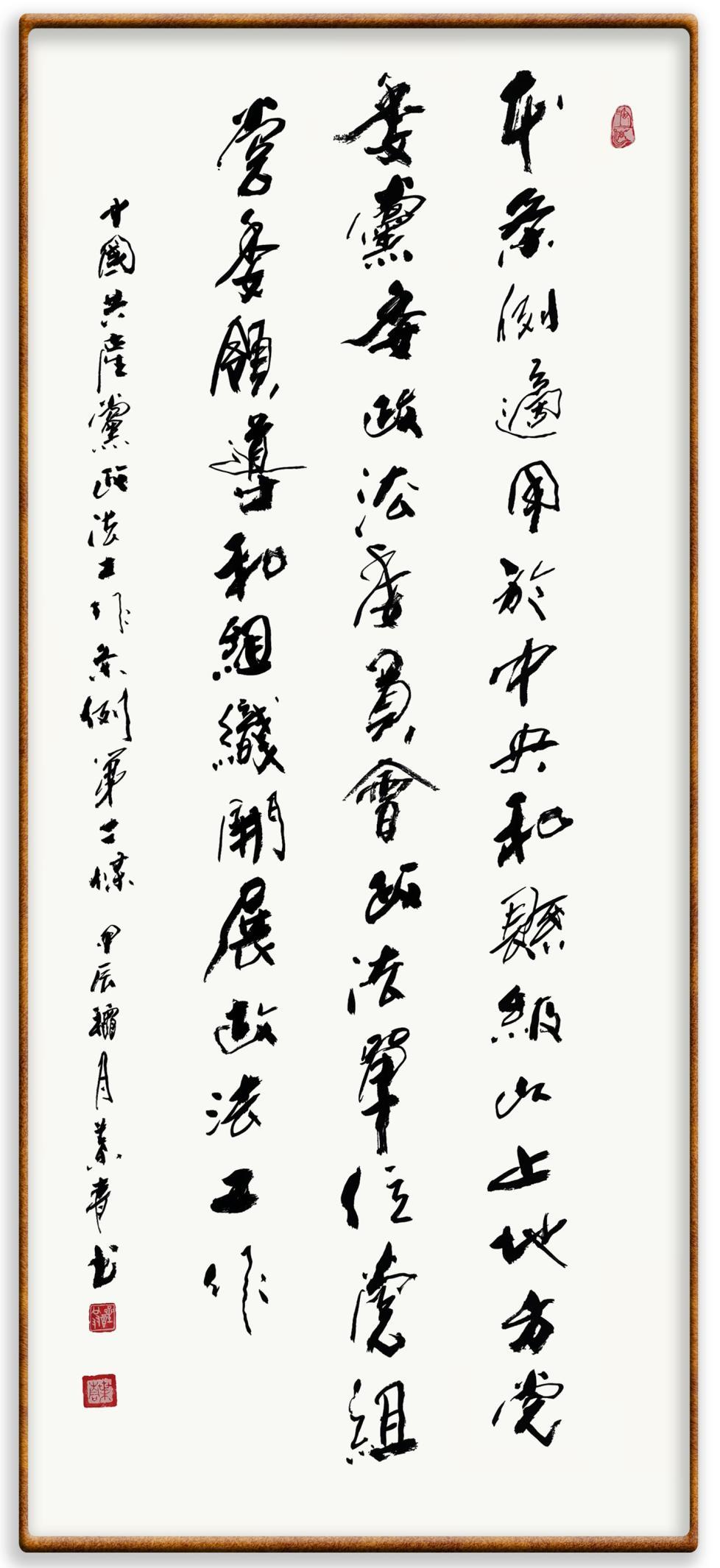 《中國共產(chǎn)黨政法工作條例》對黨領(lǐng)導(dǎo)新時代政法工作進行全面制度擘畫,為黨領(lǐng)導(dǎo)政法工作提供基本遵循,具有重大而深遠(yuǎn)的意義。為學(xué)習(xí)好、宣傳好、貫徹好、實施好這部黨內(nèi)法規(guī),繼《中華人民共和國民法典》《中華人民共和國憲法》《信訪工作條例》《中華人民共和國澳門特別行政區(qū)基本法》《中華人民共和國香港特別行政區(qū)基本法》等法律法規(guī)之后,“書·法”系列活動將筆端對準(zhǔn)《中國共產(chǎn)黨政法工作條例》。