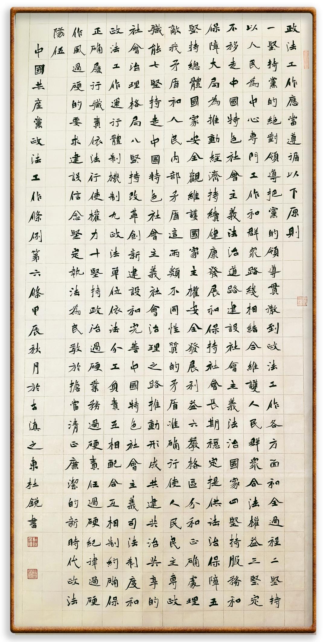 《中國共產(chǎn)黨政法工作條例》對(duì)黨領(lǐng)導(dǎo)新時(shí)代政法工作進(jìn)行全面制度擘畫,為黨領(lǐng)導(dǎo)政法工作提供基本遵循,具有重大而深遠(yuǎn)的意義。為學(xué)習(xí)好、宣傳好、貫徹好、實(shí)施好這部黨內(nèi)法規(guī),繼《中華人民共和國民法典》《中華人民共和國憲法》《信訪工作條例》《中華人民共和國澳門特別行政區(qū)基本法》《中華人民共和國香港特別行政區(qū)基本法》等法律法規(guī)之后,“書·法”系列活動(dòng)將筆端對(duì)準(zhǔn)《中國共產(chǎn)黨政法工作條例》。