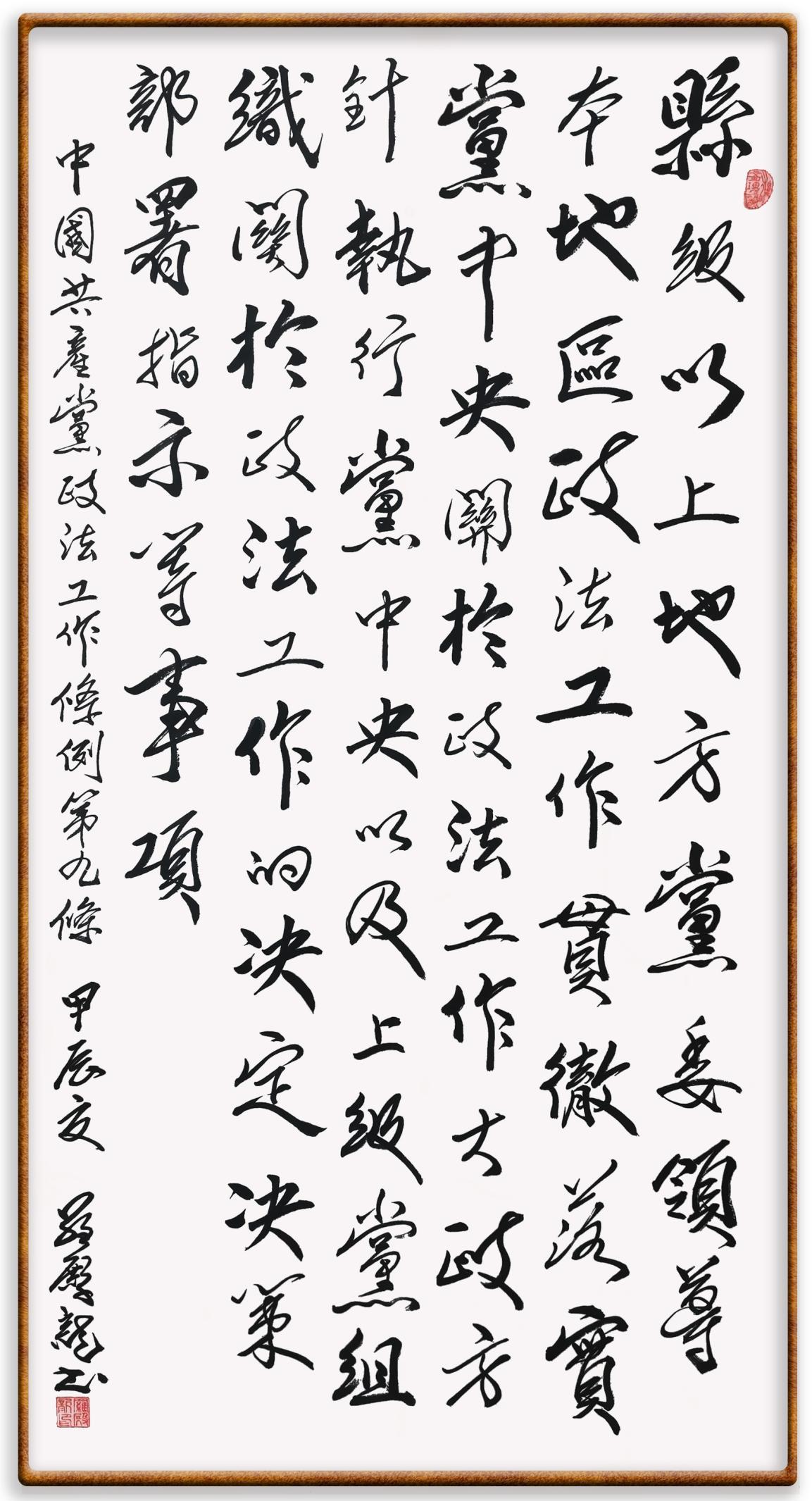 《中國共產(chǎn)黨政法工作條例》對黨領(lǐng)導(dǎo)新時代政法工作進(jìn)行全面制度擘畫,為黨領(lǐng)導(dǎo)政法工作提供基本遵循,具有重大而深遠(yuǎn)的意義。為學(xué)習(xí)好、宣傳好、貫徹好、實施好這部黨內(nèi)法規(guī),繼《中華人民共和國民法典》《中華人民共和國憲法》《信訪工作條例》《中華人民共和國澳門特別行政區(qū)基本法》《中華人民共和國香港特別行政區(qū)基本法》等法律法規(guī)之后,“書·法”系列活動將筆端對準(zhǔn)《中國共產(chǎn)黨政法工作條例》。