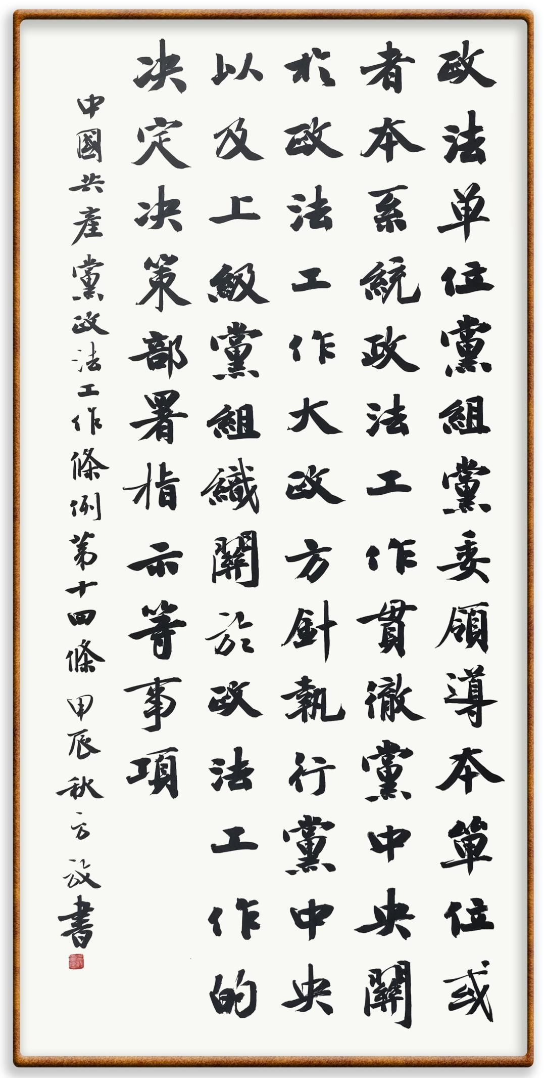 《中國共產黨政法工作條例》對黨領導新時代政法工作進行全面制度擘畫,為黨領導政法工作提供基本遵循,具有重大而深遠的意義。為學習好、宣傳好、貫徹好、實施好這部黨內法規(guī),繼《中華人民共和國民法典》《中華人民共和國憲法》《信訪工作條例》《中華人民共和國澳門特別行政區(qū)基本法》《中華人民共和國香港特別行政區(qū)基本法》等法律法規(guī)之后,“書·法”系列活動將筆端對準《中國共產黨政法工作條例》。