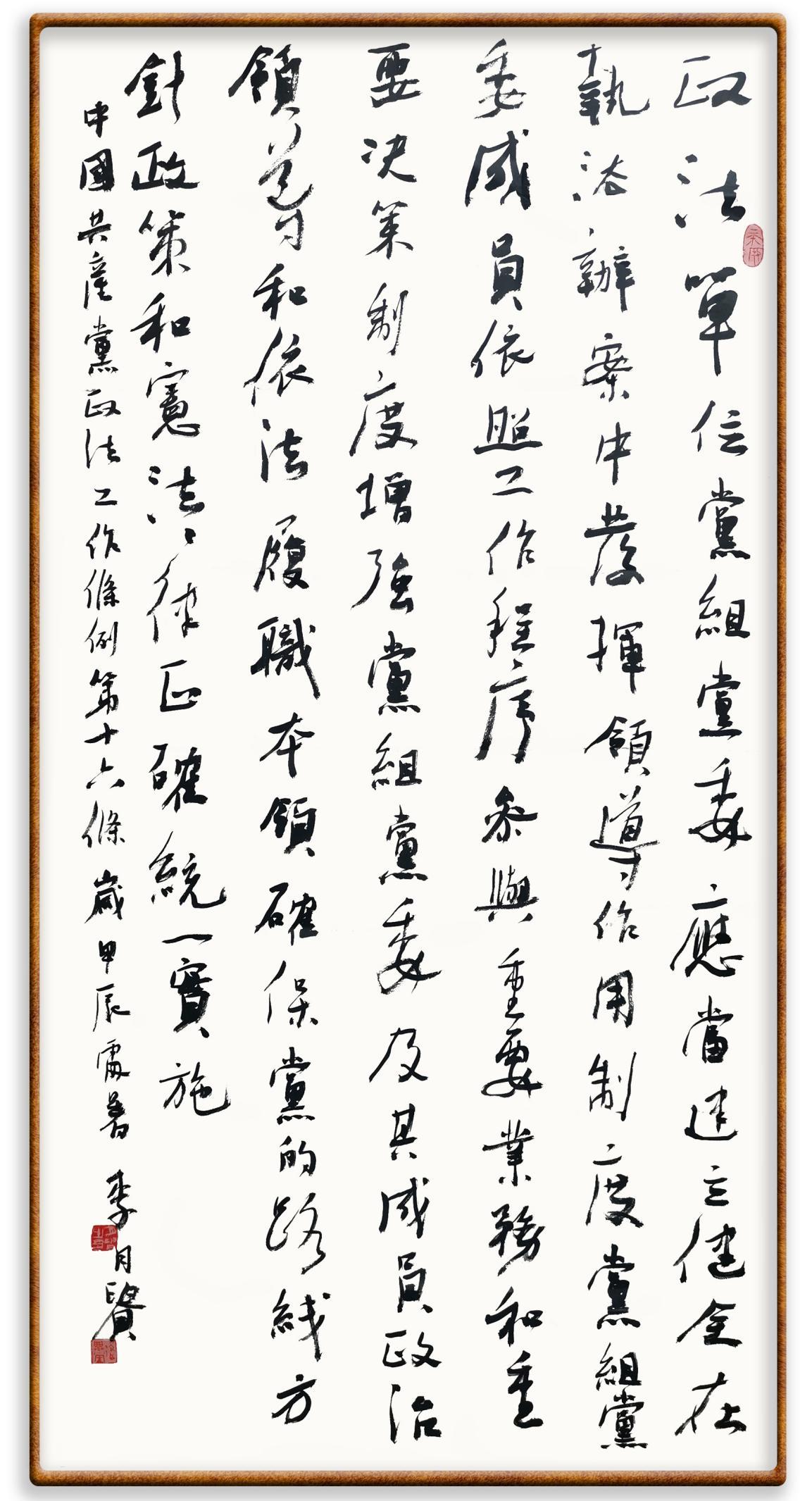 《中國共產(chǎn)黨政法工作條例》對黨領(lǐng)導(dǎo)新時代政法工作進(jìn)行全面制度擘畫,為黨領(lǐng)導(dǎo)政法工作提供基本遵循,具有重大而深遠(yuǎn)的意義。為學(xué)習(xí)好、宣傳好、貫徹好、實(shí)施好這部黨內(nèi)法規(guī),繼《中華人民共和國民法典》《中華人民共和國憲法》《信訪工作條例》《中華人民共和國澳門特別行政區(qū)基本法》《中華人民共和國香港特別行政區(qū)基本法》等法律法規(guī)之后,“書·法”系列活動將筆端對準(zhǔn)《中國共產(chǎn)黨政法工作條例》。