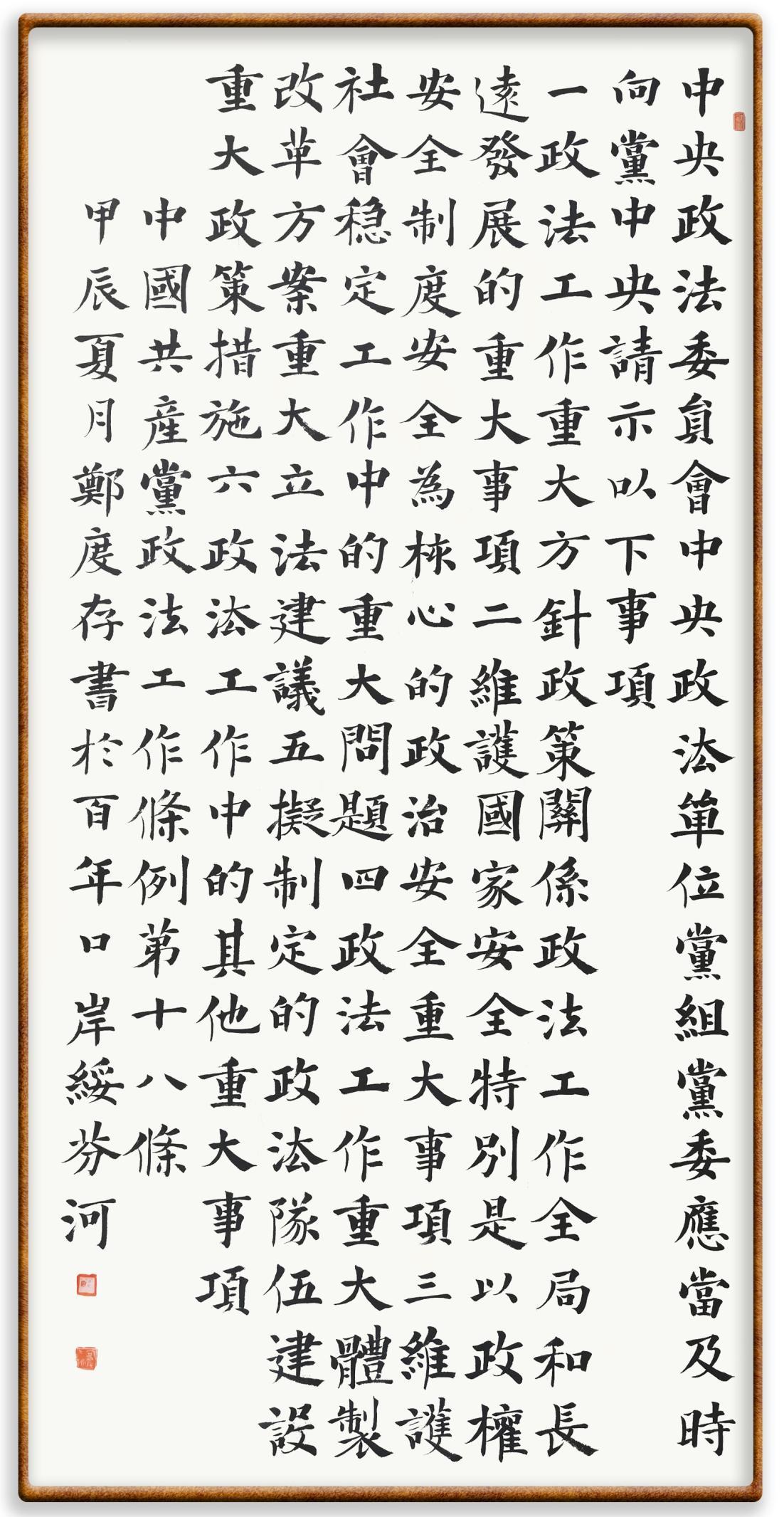 《中國(guó)共產(chǎn)黨政法工作條例》對(duì)黨領(lǐng)導(dǎo)新時(shí)代政法工作進(jìn)行全面制度擘畫(huà),為黨領(lǐng)導(dǎo)政法工作提供基本遵循,具有重大而深遠(yuǎn)的意義。為學(xué)習(xí)好、宣傳好、貫徹好、實(shí)施好這部黨內(nèi)法規(guī),繼《中華人民共和國(guó)民法典》《中華人民共和國(guó)憲法》《信訪(fǎng)工作條例》《中華人民共和國(guó)澳門(mén)特別行政區(qū)基本法》《中華人民共和國(guó)香港特別行政區(qū)基本法》等法律法規(guī)之后,“書(shū)·法”系列活動(dòng)將筆端對(duì)準(zhǔn)《中國(guó)共產(chǎn)黨政法工作條例》。