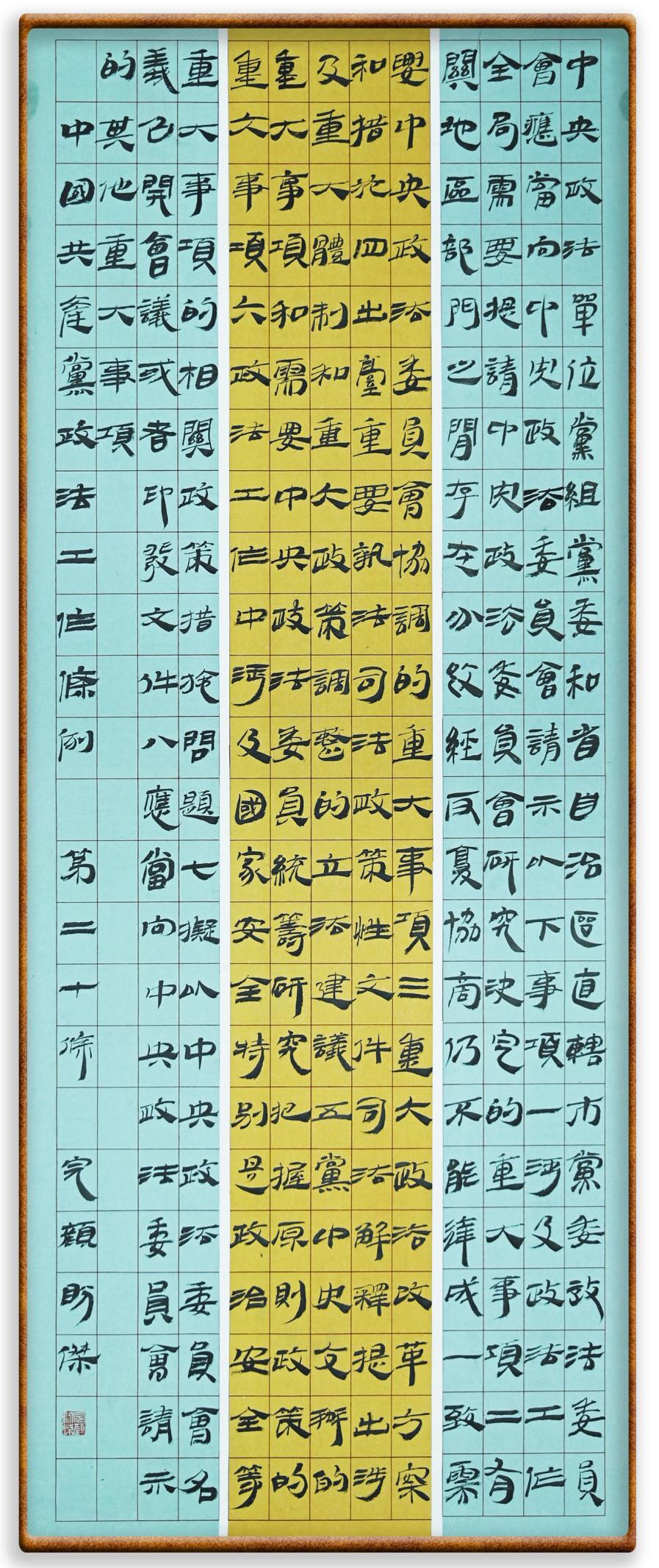 《中國共產(chǎn)黨政法工作條例》對黨領(lǐng)導(dǎo)新時代政法工作進(jìn)行全面制度擘畫,為黨領(lǐng)導(dǎo)政法工作提供基本遵循,具有重大而深遠(yuǎn)的意義。為學(xué)習(xí)好、宣傳好、貫徹好、實(shí)施好這部黨內(nèi)法規(guī),繼《中華人民共和國民法典》《中華人民共和國憲法》《信訪工作條例》《中華人民共和國澳門特別行政區(qū)基本法》《中華人民共和國香港特別行政區(qū)基本法》等法律法規(guī)之后,“書·法”系列活動將筆端對準(zhǔn)《中國共產(chǎn)黨政法工作條例》。