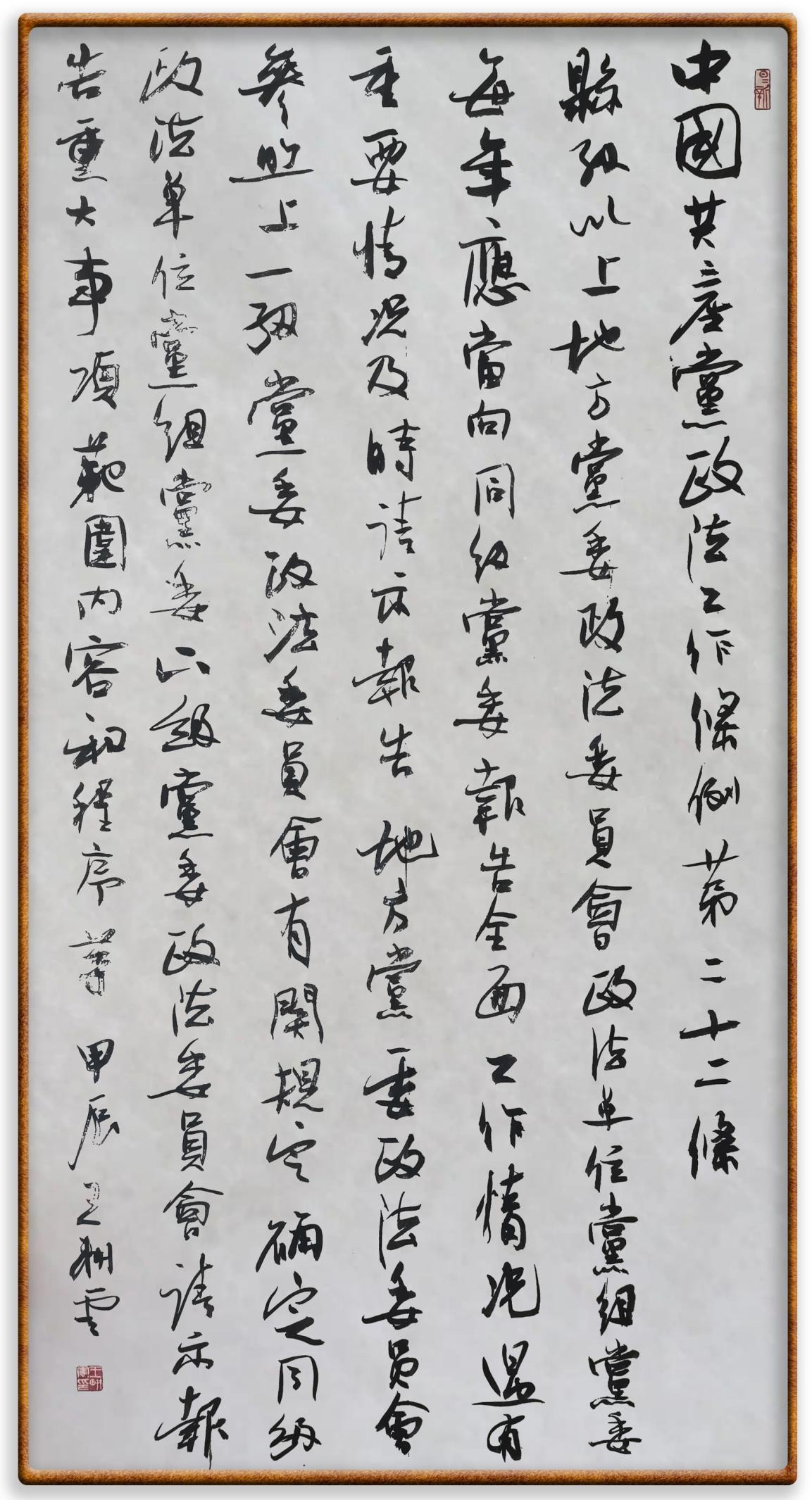 《中國共產(chǎn)黨政法工作條例》對黨領(lǐng)導(dǎo)新時代政法工作進行全面制度擘畫,為黨領(lǐng)導(dǎo)政法工作提供基本遵循,具有重大而深遠的意義。為學(xué)習(xí)好、宣傳好、貫徹好、實施好這部黨內(nèi)法規(guī),繼《中華人民共和國民法典》《中華人民共和國憲法》《信訪工作條例》《中華人民共和國澳門特別行政區(qū)基本法》《中華人民共和國香港特別行政區(qū)基本法》等法律法規(guī)之后,“書·法”系列活動將筆端對準《中國共產(chǎn)黨政法工作條例》。