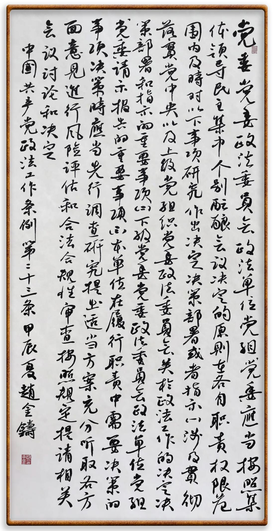 《中國(guó)共產(chǎn)黨政法工作條例》對(duì)黨領(lǐng)導(dǎo)新時(shí)代政法工作進(jìn)行全面制度擘畫(huà),為黨領(lǐng)導(dǎo)政法工作提供基本遵循,具有重大而深遠(yuǎn)的意義。為學(xué)習(xí)好、宣傳好、貫徹好、實(shí)施好這部黨內(nèi)法規(guī),繼《中華人民共和國(guó)民法典》《中華人民共和國(guó)憲法》《信訪工作條例》《中華人民共和國(guó)澳門(mén)特別行政區(qū)基本法》《中華人民共和國(guó)香港特別行政區(qū)基本法》等法律法規(guī)之后,“書(shū)·法”系列活動(dòng)將筆端對(duì)準(zhǔn)《中國(guó)共產(chǎn)黨政法工作條例》。