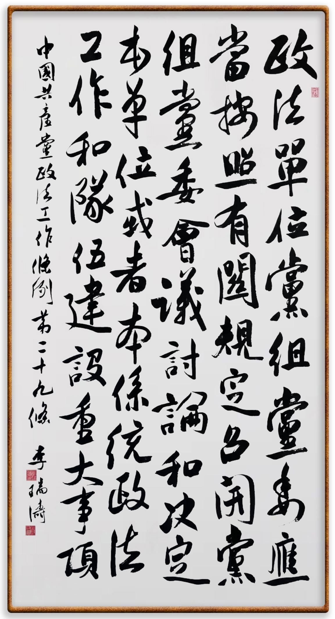 《中國共產(chǎn)黨政法工作條例》對黨領(lǐng)導(dǎo)新時代政法工作進行全面制度擘畫,為黨領(lǐng)導(dǎo)政法工作提供基本遵循,具有重大而深遠的意義。為學(xué)習(xí)好、宣傳好、貫徹好、實施好這部黨內(nèi)法規(guī),繼《中華人民共和國民法典》《中華人民共和國憲法》《信訪工作條例》《中華人民共和國澳門特別行政區(qū)基本法》《中華人民共和國香港特別行政區(qū)基本法》等法律法規(guī)之后,“書·法”系列活動將筆端對準(zhǔn)《中國共產(chǎn)黨政法工作條例》。