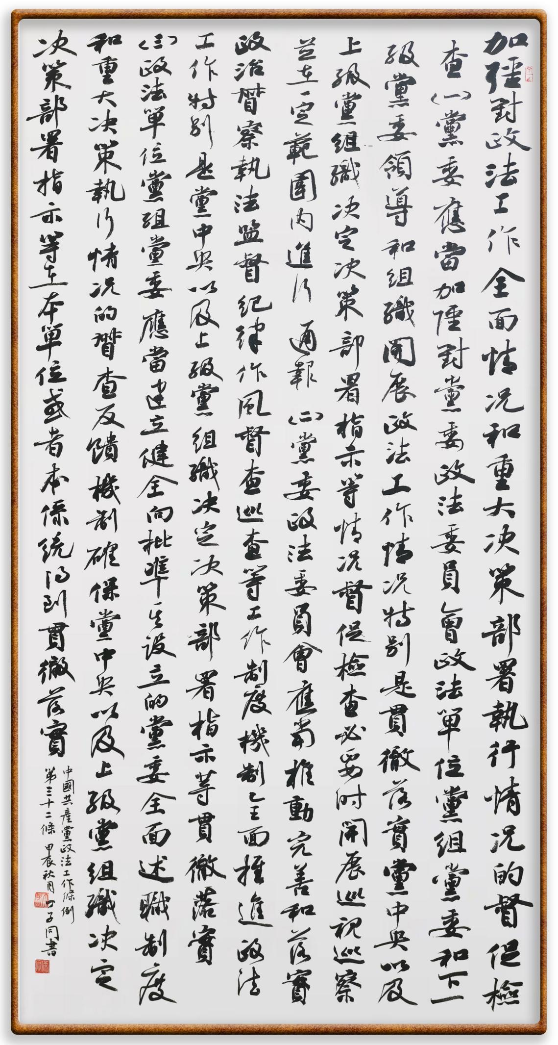 《中國共產(chǎn)黨政法工作條例》對(duì)黨領(lǐng)導(dǎo)新時(shí)代政法工作進(jìn)行全面制度擘畫,為黨領(lǐng)導(dǎo)政法工作提供基本遵循,具有重大而深遠(yuǎn)的意義。為學(xué)習(xí)好、宣傳好、貫徹好、實(shí)施好這部黨內(nèi)法規(guī),繼《中華人民共和國民法典》《中華人民共和國憲法》《信訪工作條例》《中華人民共和國澳門特別行政區(qū)基本法》《中華人民共和國香港特別行政區(qū)基本法》等法律法規(guī)之后,“書·法”系列活動(dòng)將筆端對(duì)準(zhǔn)《中國共產(chǎn)黨政法工作條例》。