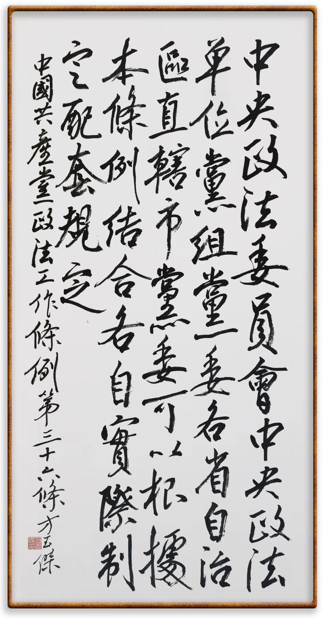 《中國共產黨政法工作條例》對黨領導新時代政法工作進行全面制度擘畫,為黨領導政法工作提供基本遵循,具有重大而深遠的意義。為學習好、宣傳好、貫徹好、實施好這部黨內法規(guī),繼《中華人民共和國民法典》《中華人民共和國憲法》《信訪工作條例》《中華人民共和國澳門特別行政區(qū)基本法》《中華人民共和國香港特別行政區(qū)基本法》等法律法規(guī)之后,“書·法”系列活動將筆端對準《中國共產黨政法工作條例》。