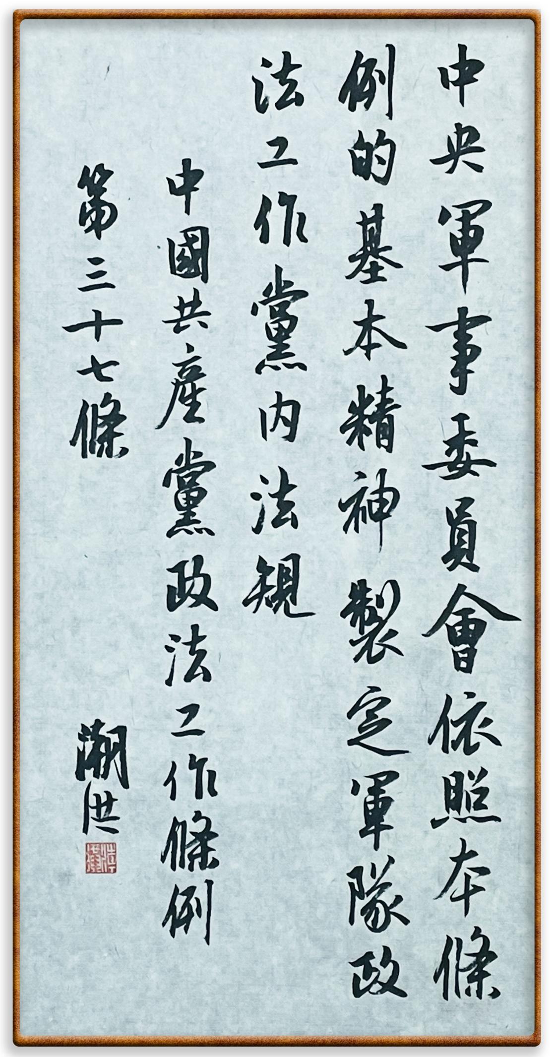 《中國共產黨政法工作條例》對黨領導新時代政法工作進行全面制度擘畫,為黨領導政法工作提供基本遵循,具有重大而深遠的意義。為學習好、宣傳好、貫徹好、實施好這部黨內法規(guī),繼《中華人民共和國民法典》《中華人民共和國憲法》《信訪工作條例》《中華人民共和國澳門特別行政區(qū)基本法》《中華人民共和國香港特別行政區(qū)基本法》等法律法規(guī)之后,“書·法”系列活動將筆端對準《中國共產黨政法工作條例》。