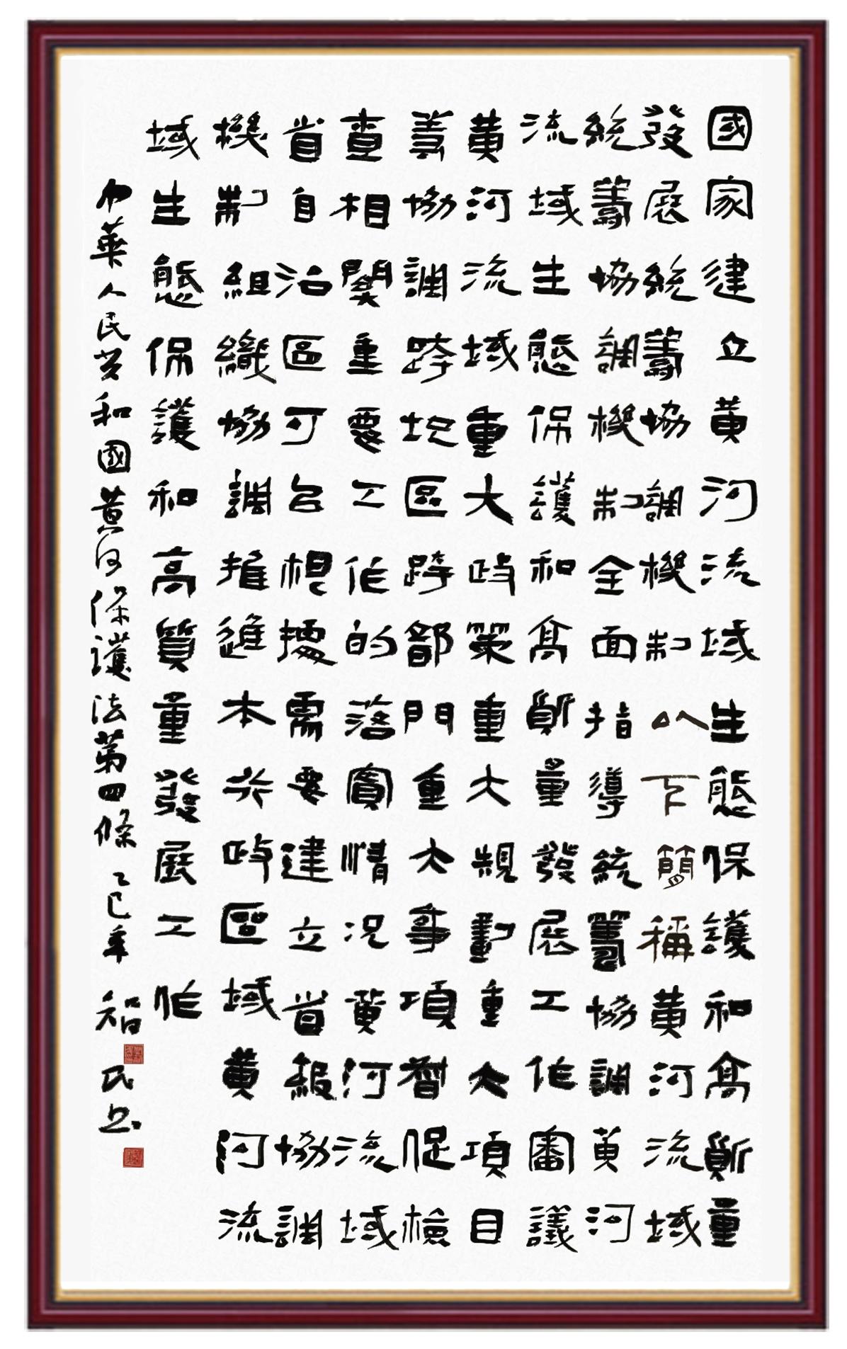 黃河寧,天下平。黃河是中華民族的發(fā)源地和搖籃,保護(hù)黃河是事關(guān)中華民族偉大復(fù)興的千秋大計。《中華人民共和國黃河保護(hù)法》為推進(jìn)水資源節(jié)約集約利用、保護(hù)傳承弘揚(yáng)黃河文化、推動黃河流域生態(tài)保護(hù)和高質(zhì)量發(fā)展提供了有力法治保障。繼書寫《中華人民共和國民法典》《中華人民共和國憲法》《中華人民共和國澳門特別行政區(qū)基本法》《中華人民共和國香港特別行政區(qū)基本法》《中華人民共和國國旗法》《中華人民共和國國徽法》《中華人民共和國國歌法》《中華人民共和國法官法》等法律法規(guī)之后,法制日報社聯(lián)合沿黃九省(區(qū))司法廳、書法家協(xié)會,將筆端對準(zhǔn)《中華人民共和國黃河保護(hù)法》。
