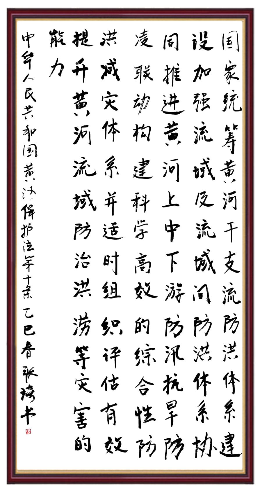 黃河寧,天下平。黃河是中華民族的發(fā)源地和搖籃,保護黃河是事關(guān)中華民族偉大復興的千秋大計。《中華人民共和國黃河保護法》為推進水資源節(jié)約集約利用、保護傳承弘揚黃河文化、推動黃河流域生態(tài)保護和高質(zhì)量發(fā)展提供了有力法治保障。繼書寫《中華人民共和國民法典》《中華人民共和國憲法》《中華人民共和國澳門特別行政區(qū)基本法》《中華人民共和國香港特別行政區(qū)基本法》《中華人民共和國國旗法》《中華人民共和國國徽法》《中華人民共和國國歌法》《中華人民共和國法官法》等法律法規(guī)之后,法制日報社聯(lián)合沿黃九?。▍^(qū))司法廳、書法家協(xié)會,將筆端對準《中華人民共和國黃河保護法》。
