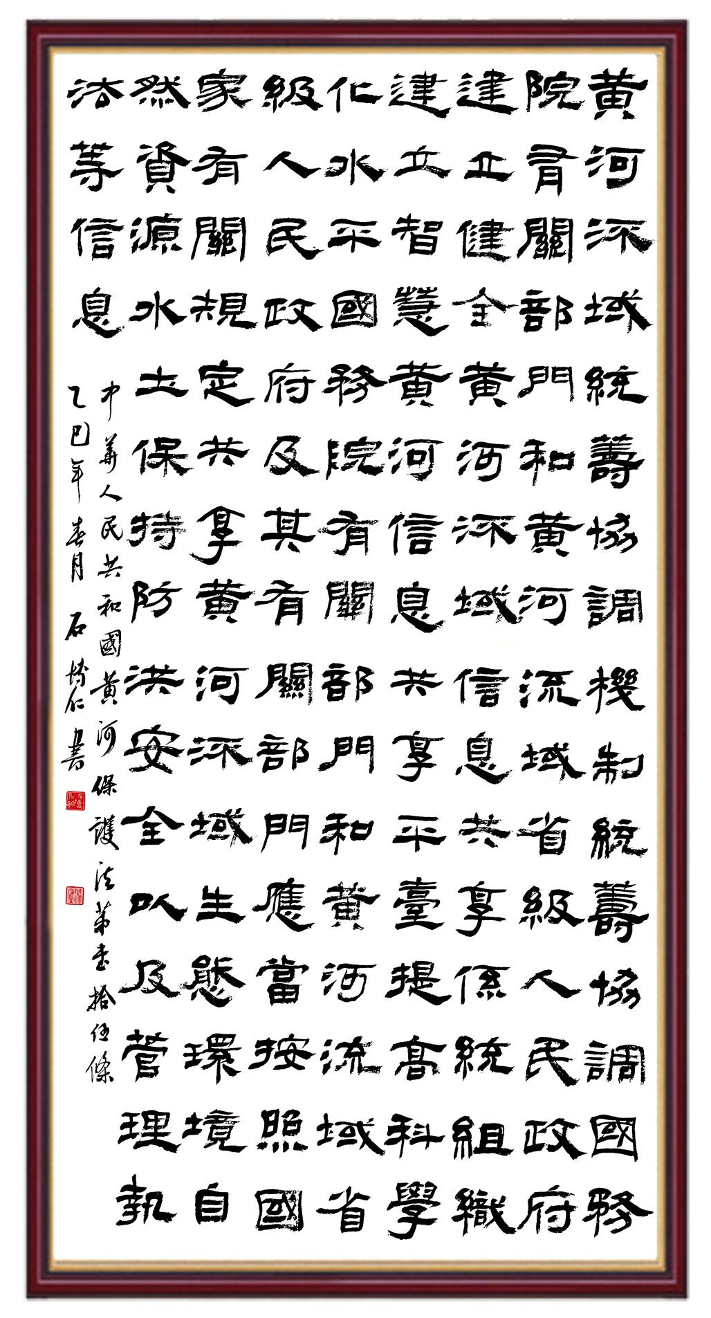 黃河寧,天下平。黃河是中華民族的發(fā)源地和搖籃,保護黃河是事關中華民族偉大復興的千秋大計?!吨腥A人民共和國黃河保護法》為推進水資源節(jié)約集約利用、保護傳承弘揚黃河文化、推動黃河流域生態(tài)保護和高質量發(fā)展提供了有力法治保障。繼書寫《中華人民共和國民法典》《中華人民共和國憲法》《中華人民共和國澳門特別行政區(qū)基本法》《中華人民共和國香港特別行政區(qū)基本法》《中華人民共和國國旗法》《中華人民共和國國徽法》《中華人民共和國國歌法》《中華人民共和國法官法》等法律法規(guī)之后,法制日報社聯(lián)合沿黃九?。▍^(qū))司法廳、書法家協(xié)會,將筆端對準《中華人民共和國黃河保護法》。