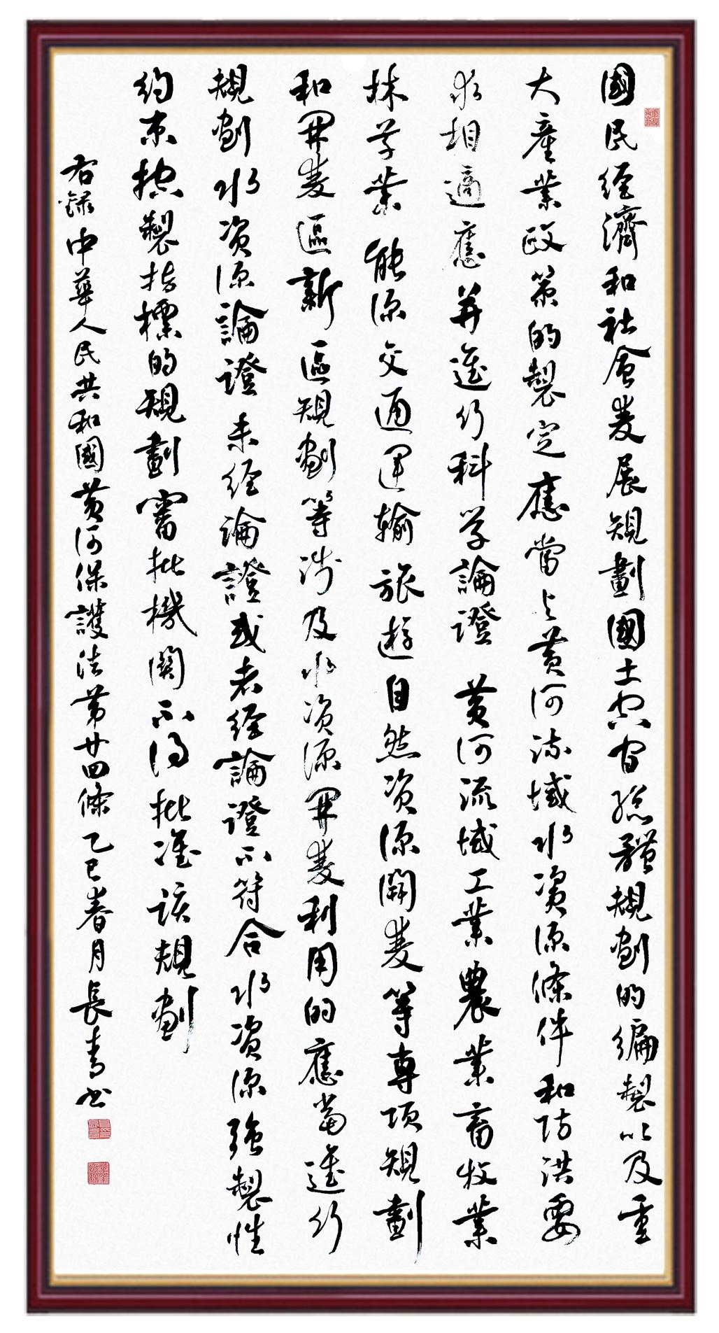 黃河寧,天下平。黃河是中華民族的發(fā)源地和搖籃,保護(hù)黃河是事關(guān)中華民族偉大復(fù)興的千秋大計(jì)?!吨腥A人民共和國黃河保護(hù)法》為推進(jìn)水資源節(jié)約集約利用、保護(hù)傳承弘揚(yáng)黃河文化、推動(dòng)黃河流域生態(tài)保護(hù)和高質(zhì)量發(fā)展提供了有力法治保障。繼書寫《中華人民共和國民法典》《中華人民共和國憲法》《中華人民共和國澳門特別行政區(qū)基本法》《中華人民共和國香港特別行政區(qū)基本法》《中華人民共和國國旗法》《中華人民共和國國徽法》《中華人民共和國國歌法》《中華人民共和國法官法》等法律法規(guī)之后,法制日?qǐng)?bào)社聯(lián)合沿黃九?。▍^(qū))司法廳、書法家協(xié)會(huì),將筆端對(duì)準(zhǔn)《中華人民共和國黃河保護(hù)法》。