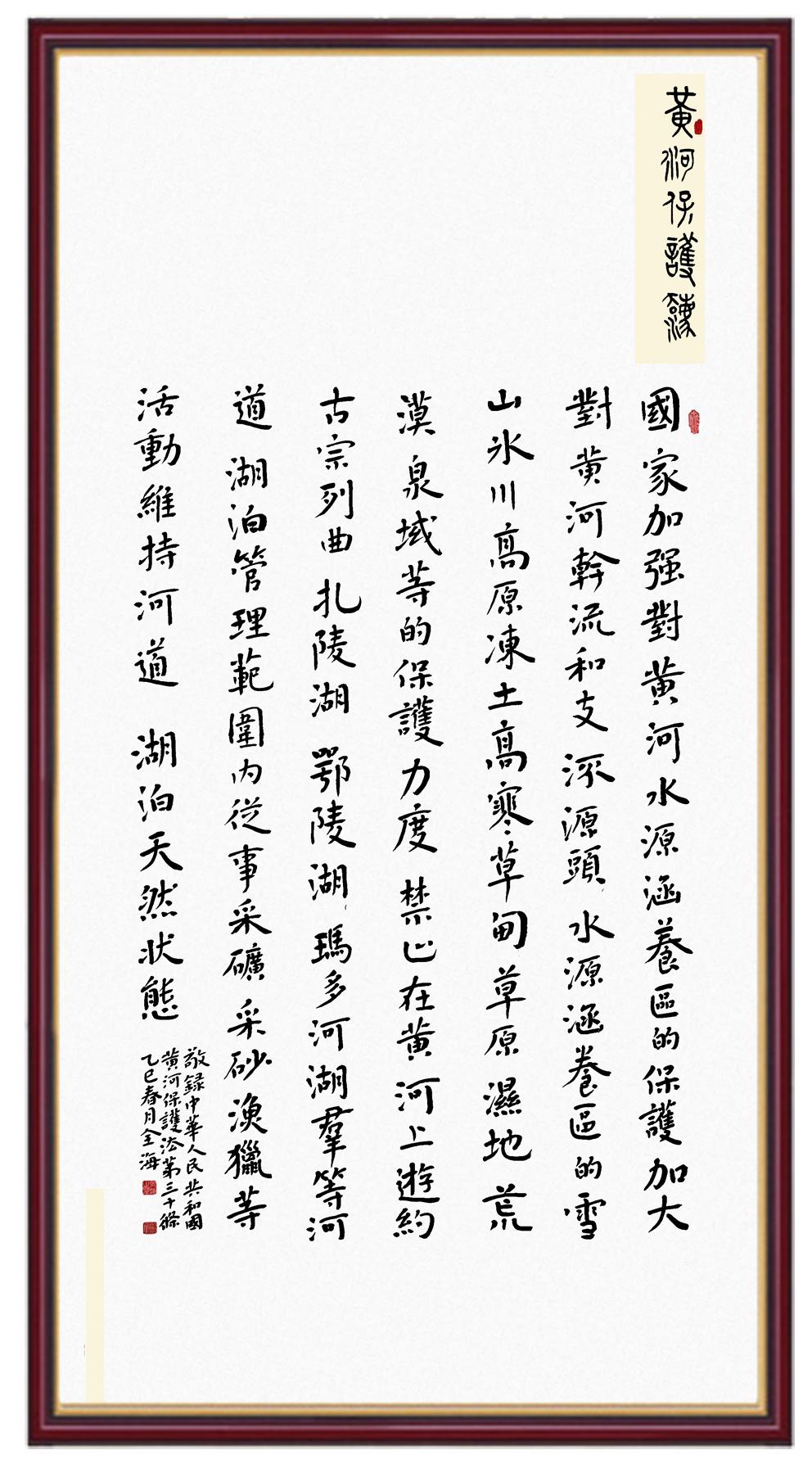 黃河寧,天下平。黃河是中華民族的發(fā)源地和搖籃,保護(hù)黃河是事關(guān)中華民族偉大復(fù)興的千秋大計(jì)?!吨腥A人民共和國(guó)黃河保護(hù)法》為推進(jìn)水資源節(jié)約集約利用、保護(hù)傳承弘揚(yáng)黃河文化、推動(dòng)黃河流域生態(tài)保護(hù)和高質(zhì)量發(fā)展提供了有力法治保障。繼書(shū)寫(xiě)《中華人民共和國(guó)民法典》《中華人民共和國(guó)憲法》《中華人民共和國(guó)澳門(mén)特別行政區(qū)基本法》《中華人民共和國(guó)香港特別行政區(qū)基本法》《中華人民共和國(guó)國(guó)旗法》《中華人民共和國(guó)國(guó)徽法》《中華人民共和國(guó)國(guó)歌法》《中華人民共和國(guó)法官法》等法律法規(guī)之后,法制日?qǐng)?bào)社聯(lián)合沿黃九省(區(qū))司法廳、書(shū)法家協(xié)會(huì),將筆端對(duì)準(zhǔn)《中華人民共和國(guó)黃河保護(hù)法》。