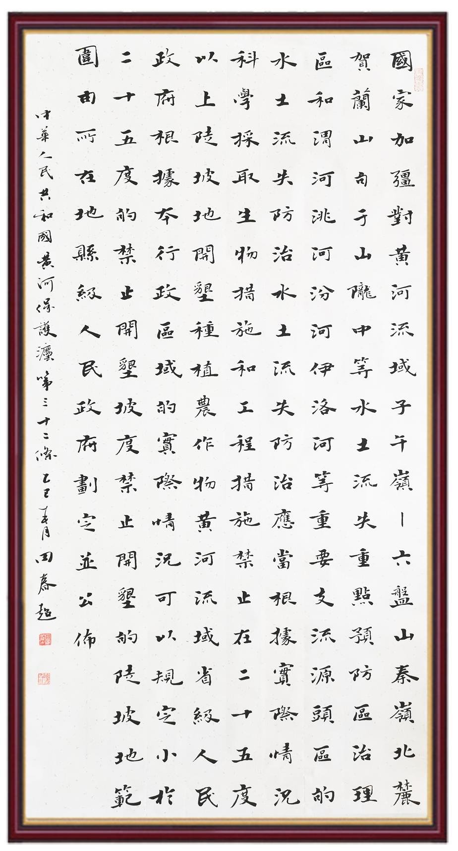 黃河寧,天下平。黃河是中華民族的發(fā)源地和搖籃,保護(hù)黃河是事關(guān)中華民族偉大復(fù)興的千秋大計(jì)?!吨腥A人民共和國黃河保護(hù)法》為推進(jìn)水資源節(jié)約集約利用、保護(hù)傳承弘揚(yáng)黃河文化、推動(dòng)黃河流域生態(tài)保護(hù)和高質(zhì)量發(fā)展提供了有力法治保障。繼書寫《中華人民共和國民法典》《中華人民共和國憲法》《中華人民共和國澳門特別行政區(qū)基本法》《中華人民共和國香港特別行政區(qū)基本法》《中華人民共和國國旗法》《中華人民共和國國徽法》《中華人民共和國國歌法》《中華人民共和國法官法》等法律法規(guī)之后,法制日?qǐng)?bào)社聯(lián)合沿黃九省(區(qū))司法廳、書法家協(xié)會(huì),將筆端對(duì)準(zhǔn)《中華人民共和國黃河保護(hù)法》。