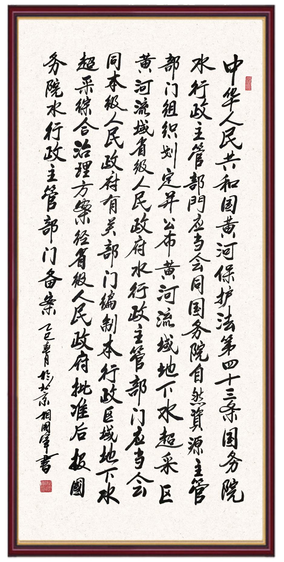 黃河寧,天下平。黃河是中華民族的發(fā)源地和搖籃,保護(hù)黃河是事關(guān)中華民族偉大復(fù)興的千秋大計?!吨腥A人民共和國黃河保護(hù)法》為推進(jìn)水資源節(jié)約集約利用、保護(hù)傳承弘揚(yáng)黃河文化、推動黃河流域生態(tài)保護(hù)和高質(zhì)量發(fā)展提供了有力法治保障。繼書寫《中華人民共和國民法典》《中華人民共和國憲法》《中華人民共和國澳門特別行政區(qū)基本法》《中華人民共和國香港特別行政區(qū)基本法》《中華人民共和國國旗法》《中華人民共和國國徽法》《中華人民共和國國歌法》《中華人民共和國法官法》等法律法規(guī)之后,法制日報社聯(lián)合沿黃九?。▍^(qū))司法廳、書法家協(xié)會,將筆端對準(zhǔn)《中華人民共和國黃河保護(hù)法》。