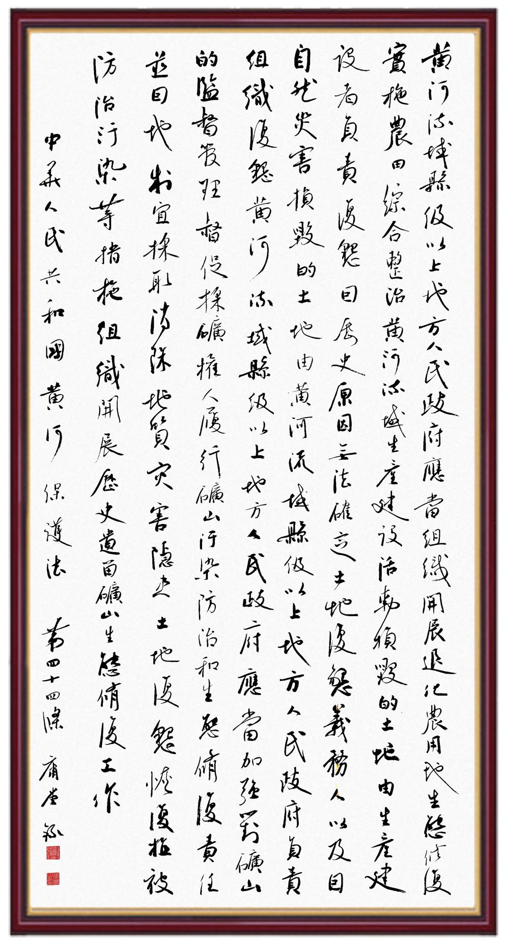 黃河寧,天下平。黃河是中華民族的發(fā)源地和搖籃,保護(hù)黃河是事關(guān)中華民族偉大復(fù)興的千秋大計(jì)?!吨腥A人民共和國(guó)黃河保護(hù)法》為推進(jìn)水資源節(jié)約集約利用、保護(hù)傳承弘揚(yáng)黃河文化、推動(dòng)黃河流域生態(tài)保護(hù)和高質(zhì)量發(fā)展提供了有力法治保障。繼書寫《中華人民共和國(guó)民法典》《中華人民共和國(guó)憲法》《中華人民共和國(guó)澳門特別行政區(qū)基本法》《中華人民共和國(guó)香港特別行政區(qū)基本法》《中華人民共和國(guó)國(guó)旗法》《中華人民共和國(guó)國(guó)徽法》《中華人民共和國(guó)國(guó)歌法》《中華人民共和國(guó)法官法》等法律法規(guī)之后,法制日?qǐng)?bào)社聯(lián)合沿黃九?。▍^(qū))司法廳、書法家協(xié)會(huì),將筆端對(duì)準(zhǔn)《中華人民共和國(guó)黃河保護(hù)法》。