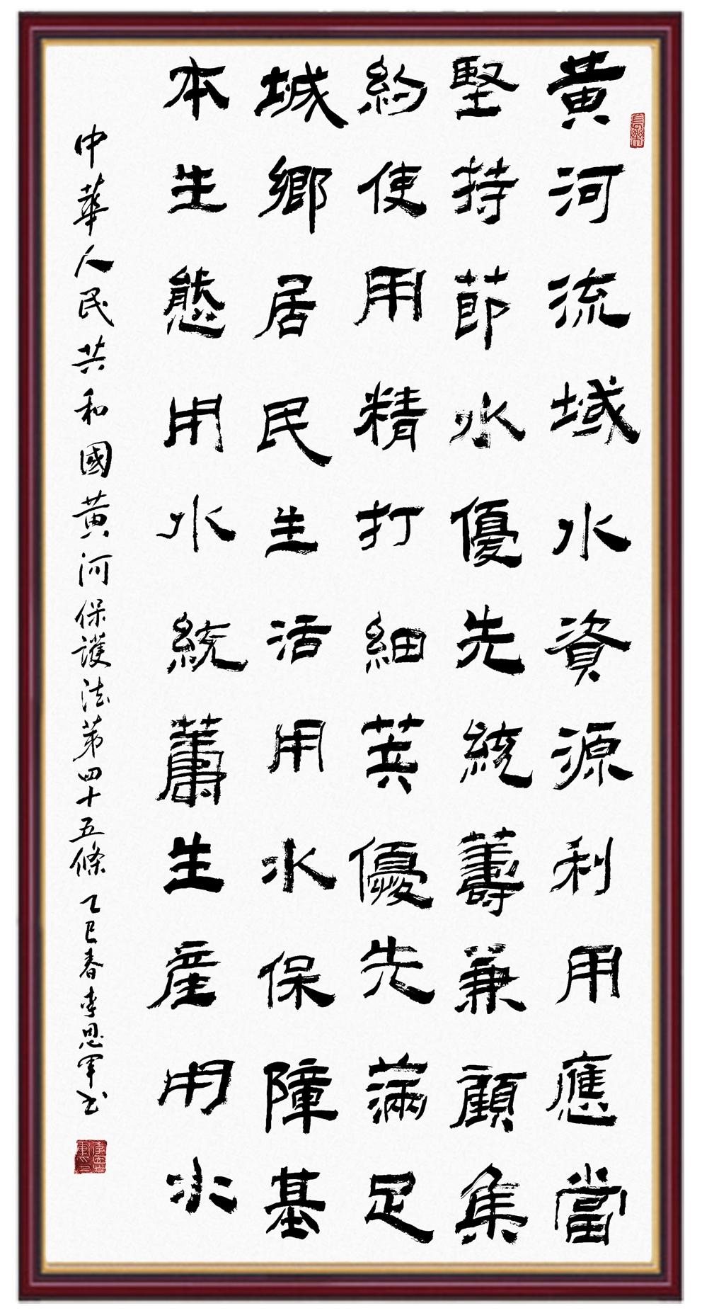 黃河寧,天下平。黃河是中華民族的發(fā)源地和搖籃,保護(hù)黃河是事關(guān)中華民族偉大復(fù)興的千秋大計(jì)?!吨腥A人民共和國黃河保護(hù)法》為推進(jìn)水資源節(jié)約集約利用、保護(hù)傳承弘揚(yáng)黃河文化、推動(dòng)黃河流域生態(tài)保護(hù)和高質(zhì)量發(fā)展提供了有力法治保障。繼書寫《中華人民共和國民法典》《中華人民共和國憲法》《中華人民共和國澳門特別行政區(qū)基本法》《中華人民共和國香港特別行政區(qū)基本法》《中華人民共和國國旗法》《中華人民共和國國徽法》《中華人民共和國國歌法》《中華人民共和國法官法》等法律法規(guī)之后,法制日報(bào)社聯(lián)合沿黃九?。▍^(qū))司法廳、書法家協(xié)會(huì),將筆端對準(zhǔn)《中華人民共和國黃河保護(hù)法》。