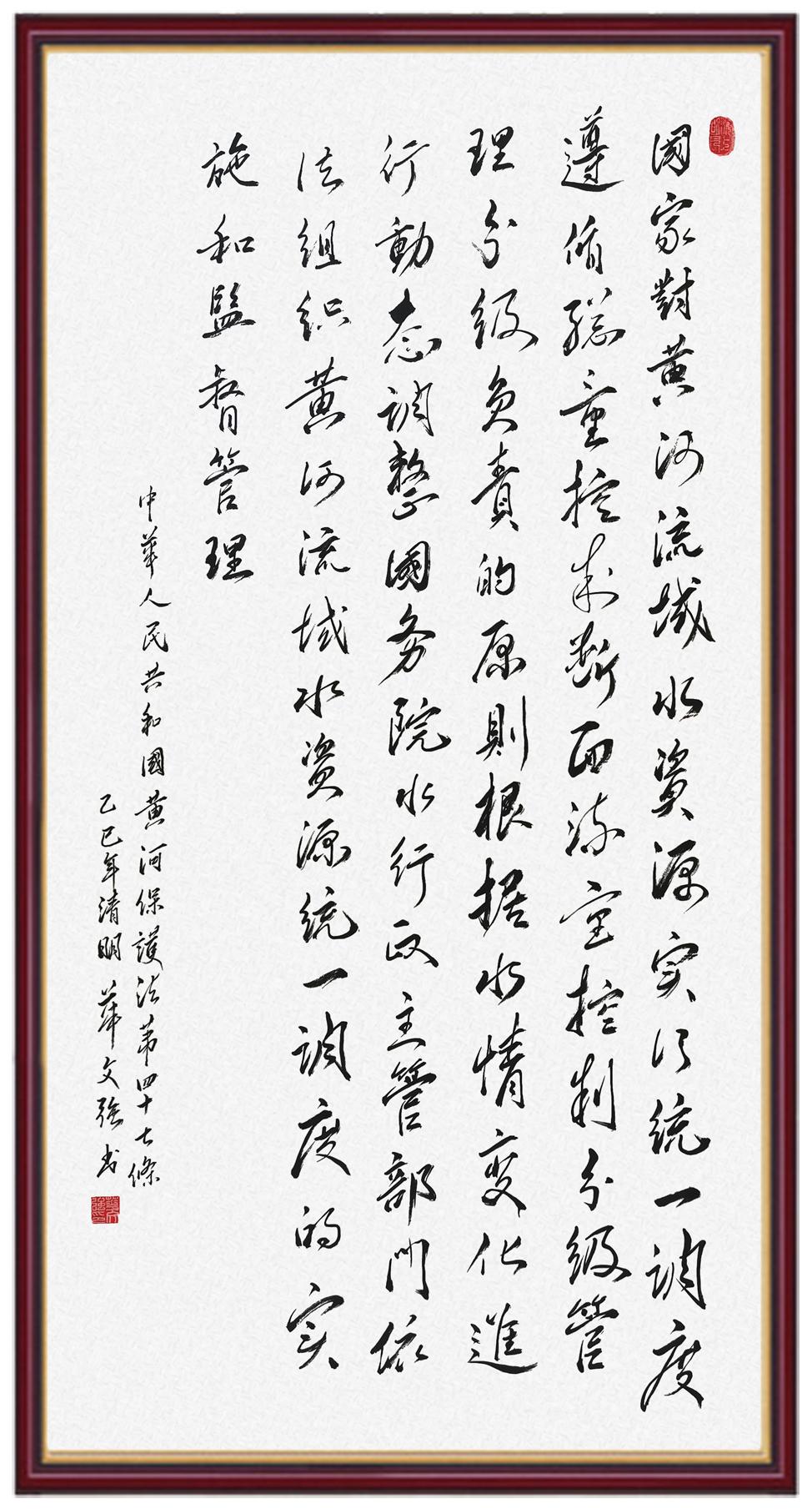 黃河寧,天下平。黃河是中華民族的發(fā)源地和搖籃,保護(hù)黃河是事關(guān)中華民族偉大復(fù)興的千秋大計?!吨腥A人民共和國黃河保護(hù)法》為推進(jìn)水資源節(jié)約集約利用、保護(hù)傳承弘揚黃河文化、推動黃河流域生態(tài)保護(hù)和高質(zhì)量發(fā)展提供了有力法治保障。繼書寫《中華人民共和國民法典》《中華人民共和國憲法》《中華人民共和國澳門特別行政區(qū)基本法》《中華人民共和國香港特別行政區(qū)基本法》《中華人民共和國國旗法》《中華人民共和國國徽法》《中華人民共和國國歌法》《中華人民共和國法官法》等法律法規(guī)之后,法制日報社聯(lián)合沿黃九?。▍^(qū))司法廳、書法家協(xié)會,將筆端對準(zhǔn)《中華人民共和國黃河保護(hù)法》。