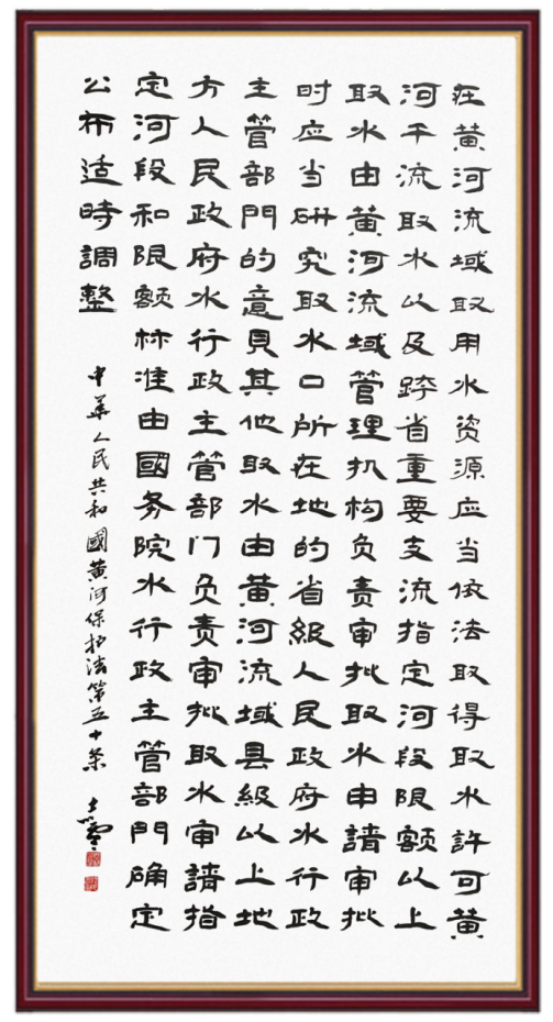黃河寧,天下平。黃河是中華民族的發(fā)源地和搖籃,保護(hù)黃河是事關(guān)中華民族偉大復(fù)興的千秋大計。《中華人民共和國黃河保護(hù)法》為推進(jìn)水資源節(jié)約集約利用、保護(hù)傳承弘揚(yáng)黃河文化、推動黃河流域生態(tài)保護(hù)和高質(zhì)量發(fā)展提供了有力法治保障。繼書寫《中華人民共和國民法典》《中華人民共和國憲法》《中華人民共和國澳門特別行政區(qū)基本法》《中華人民共和國香港特別行政區(qū)基本法》《中華人民共和國國旗法》《中華人民共和國國徽法》《中華人民共和國國歌法》《中華人民共和國法官法》等法律法規(guī)之后,法制日報社聯(lián)合沿黃九?。▍^(qū))司法廳、書法家協(xié)會,將筆端對準(zhǔn)《中華人民共和國黃河保護(hù)法》。