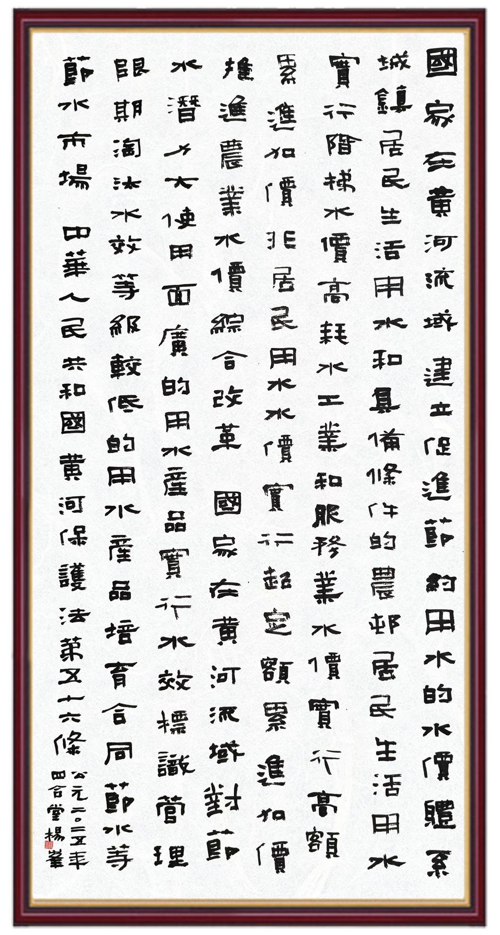 黃河寧,天下平。黃河是中華民族的發(fā)源地和搖籃,保護(hù)黃河是事關(guān)中華民族偉大復(fù)興的千秋大計(jì)。《中華人民共和國(guó)黃河保護(hù)法》為推進(jìn)水資源節(jié)約集約利用、保護(hù)傳承弘揚(yáng)黃河文化、推動(dòng)黃河流域生態(tài)保護(hù)和高質(zhì)量發(fā)展提供了有力法治保障。繼書寫《中華人民共和國(guó)民法典》《中華人民共和國(guó)憲法》《中華人民共和國(guó)澳門特別行政區(qū)基本法》《中華人民共和國(guó)香港特別行政區(qū)基本法》《中華人民共和國(guó)國(guó)旗法》《中華人民共和國(guó)國(guó)徽法》《中華人民共和國(guó)國(guó)歌法》《中華人民共和國(guó)法官法》等法律法規(guī)之后,法制日?qǐng)?bào)社聯(lián)合沿黃九?。▍^(qū))司法廳、書法家協(xié)會(huì),將筆端對(duì)準(zhǔn)《中華人民共和國(guó)黃河保護(hù)法》。