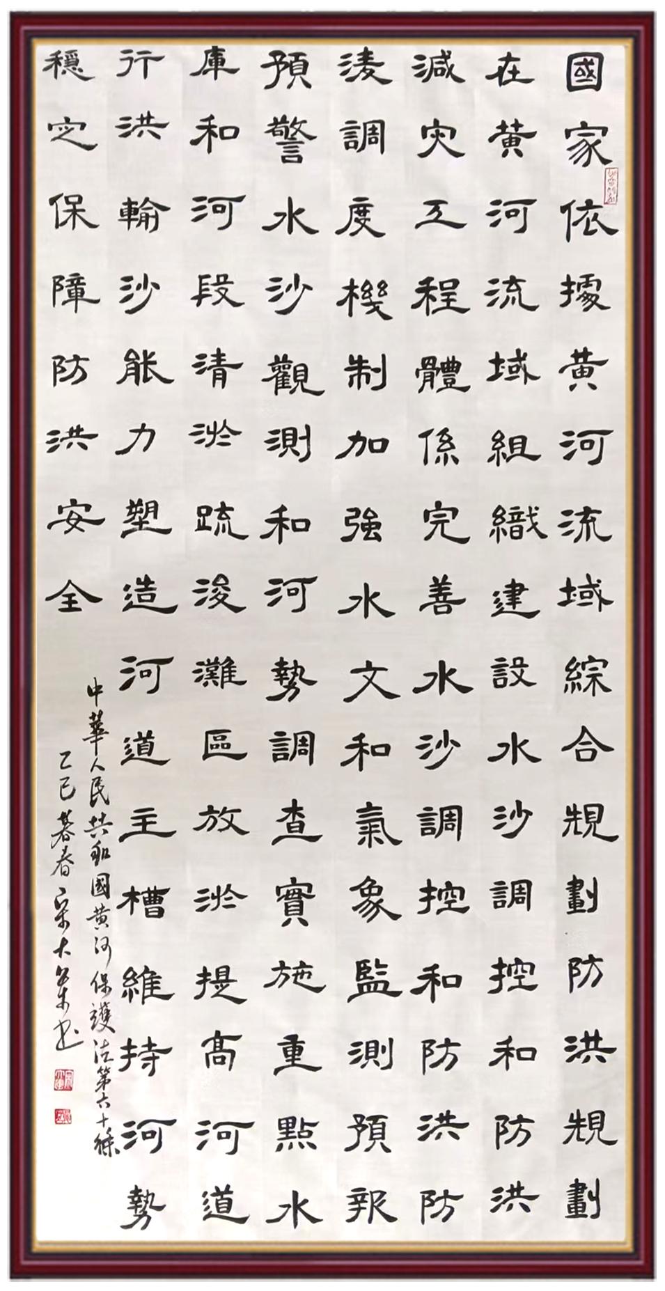 黃河寧,天下平。黃河是中華民族的發(fā)源地和搖籃,保護(hù)黃河是事關(guān)中華民族偉大復(fù)興的千秋大計(jì)?!吨腥A人民共和國黃河保護(hù)法》為推進(jìn)水資源節(jié)約集約利用、保護(hù)傳承弘揚(yáng)黃河文化、推動黃河流域生態(tài)保護(hù)和高質(zhì)量發(fā)展提供了有力法治保障。繼書寫《中華人民共和國民法典》《中華人民共和國憲法》《中華人民共和國澳門特別行政區(qū)基本法》《中華人民共和國香港特別行政區(qū)基本法》《中華人民共和國國旗法》《中華人民共和國國徽法》《中華人民共和國國歌法》《中華人民共和國法官法》等法律法規(guī)之后,法制日報(bào)社聯(lián)合沿黃九省(區(qū))司法廳、書法家協(xié)會,將筆端對準(zhǔn)《中華人民共和國黃河保護(hù)法》。