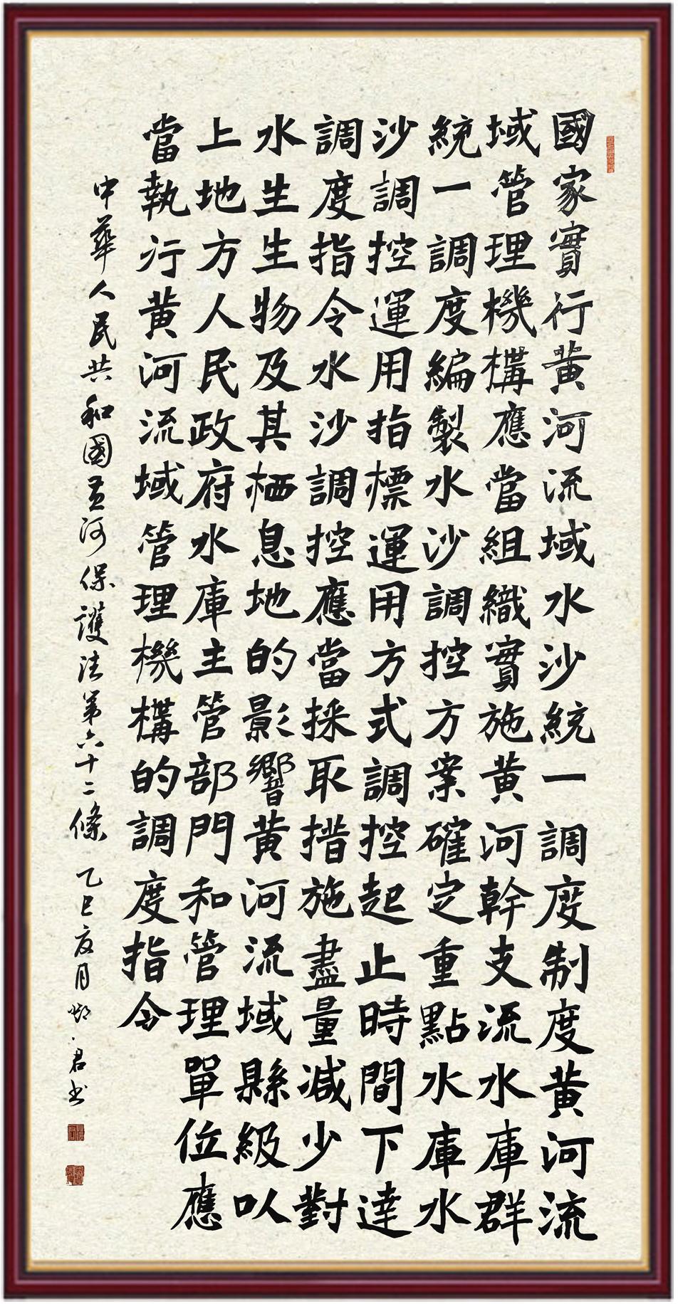 黃河寧,天下平。黃河是中華民族的發(fā)源地和搖籃,保護黃河是事關(guān)中華民族偉大復(fù)興的千秋大計?!吨腥A人民共和國黃河保護法》為推進水資源節(jié)約集約利用、保護傳承弘揚黃河文化、推動黃河流域生態(tài)保護和高質(zhì)量發(fā)展提供了有力法治保障。繼書寫《中華人民共和國民法典》《中華人民共和國憲法》《中華人民共和國澳門特別行政區(qū)基本法》《中華人民共和國香港特別行政區(qū)基本法》《中華人民共和國國旗法》《中華人民共和國國徽法》《中華人民共和國國歌法》《中華人民共和國法官法》等法律法規(guī)之后,法制日報社聯(lián)合沿黃九?。▍^(qū))司法廳、書法家協(xié)會,將筆端對準(zhǔn)《中華人民共和國黃河保護法》。