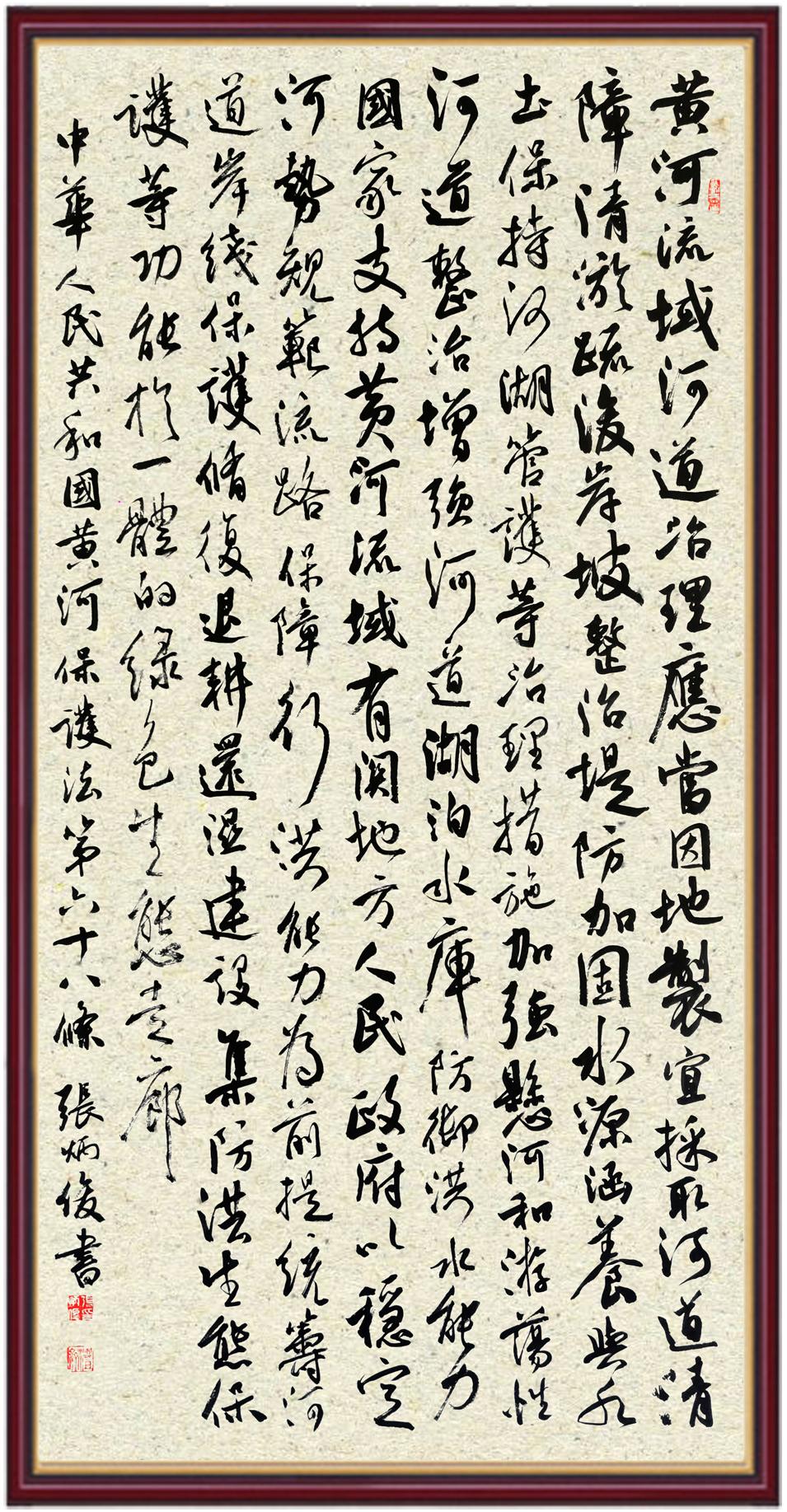 黃河寧,天下平。黃河是中華民族的發(fā)源地和搖籃,保護(hù)黃河是事關(guān)中華民族偉大復(fù)興的千秋大計(jì)?!吨腥A人民共和國(guó)黃河保護(hù)法》為推進(jìn)水資源節(jié)約集約利用、保護(hù)傳承弘揚(yáng)黃河文化、推動(dòng)黃河流域生態(tài)保護(hù)和高質(zhì)量發(fā)展提供了有力法治保障。繼書(shū)寫(xiě)《中華人民共和國(guó)民法典》《中華人民共和國(guó)憲法》《中華人民共和國(guó)澳門(mén)特別行政區(qū)基本法》《中華人民共和國(guó)香港特別行政區(qū)基本法》《中華人民共和國(guó)國(guó)旗法》《中華人民共和國(guó)國(guó)徽法》《中華人民共和國(guó)國(guó)歌法》《中華人民共和國(guó)法官法》等法律法規(guī)之后,法制日?qǐng)?bào)社聯(lián)合沿黃九?。▍^(qū))司法廳、書(shū)法家協(xié)會(huì),將筆端對(duì)準(zhǔn)《中華人民共和國(guó)黃河保護(hù)法》。