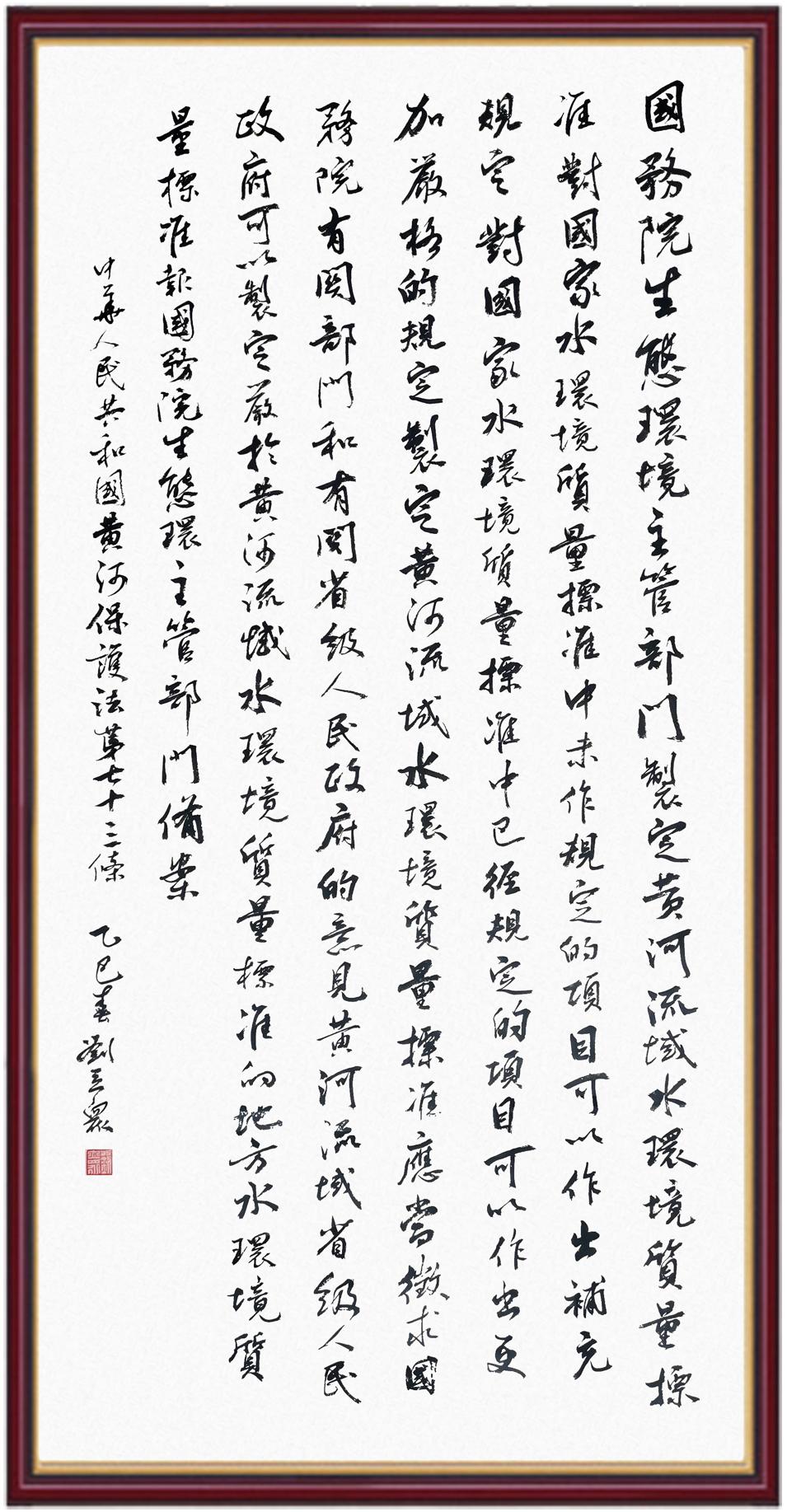 黃河寧,天下平。黃河是中華民族的發(fā)源地和搖籃,保護(hù)黃河是事關(guān)中華民族偉大復(fù)興的千秋大計(jì)。《中華人民共和國(guó)黃河保護(hù)法》為推進(jìn)水資源節(jié)約集約利用、保護(hù)傳承弘揚(yáng)黃河文化、推動(dòng)黃河流域生態(tài)保護(hù)和高質(zhì)量發(fā)展提供了有力法治保障。繼書(shū)寫(xiě)《中華人民共和國(guó)民法典》《中華人民共和國(guó)憲法》《中華人民共和國(guó)澳門(mén)特別行政區(qū)基本法》《中華人民共和國(guó)香港特別行政區(qū)基本法》《中華人民共和國(guó)國(guó)旗法》《中華人民共和國(guó)國(guó)徽法》《中華人民共和國(guó)國(guó)歌法》《中華人民共和國(guó)法官法》等法律法規(guī)之后,法制日?qǐng)?bào)社聯(lián)合沿黃九?。▍^(qū))司法廳、書(shū)法家協(xié)會(huì),將筆端對(duì)準(zhǔn)《中華人民共和國(guó)黃河保護(hù)法》。