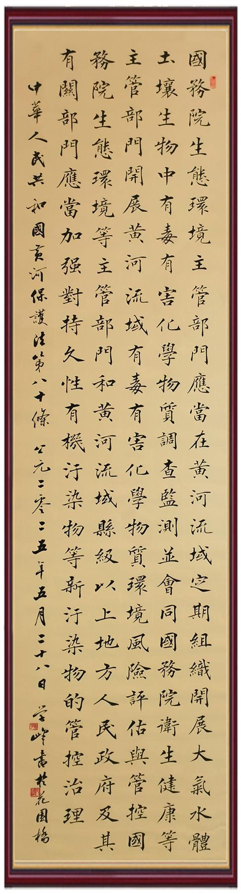 黃河寧,天下平。黃河是中華民族的發(fā)源地和搖籃,保護(hù)黃河是事關(guān)中華民族偉大復(fù)興的千秋大計(jì)?!吨腥A人民共和國黃河保護(hù)法》為推進(jìn)水資源節(jié)約集約利用、保護(hù)傳承弘揚(yáng)黃河文化、推動黃河流域生態(tài)保護(hù)和高質(zhì)量發(fā)展提供了有力法治保障。繼書寫《中華人民共和國民法典》《中華人民共和國憲法》《中華人民共和國澳門特別行政區(qū)基本法》《中華人民共和國香港特別行政區(qū)基本法》《中華人民共和國國旗法》《中華人民共和國國徽法》《中華人民共和國國歌法》《中華人民共和國法官法》等法律法規(guī)之后,法制日報(bào)社聯(lián)合沿黃九?。▍^(qū))司法廳、書法家協(xié)會,將筆端對準(zhǔn)《中華人民共和國黃河保護(hù)法》。