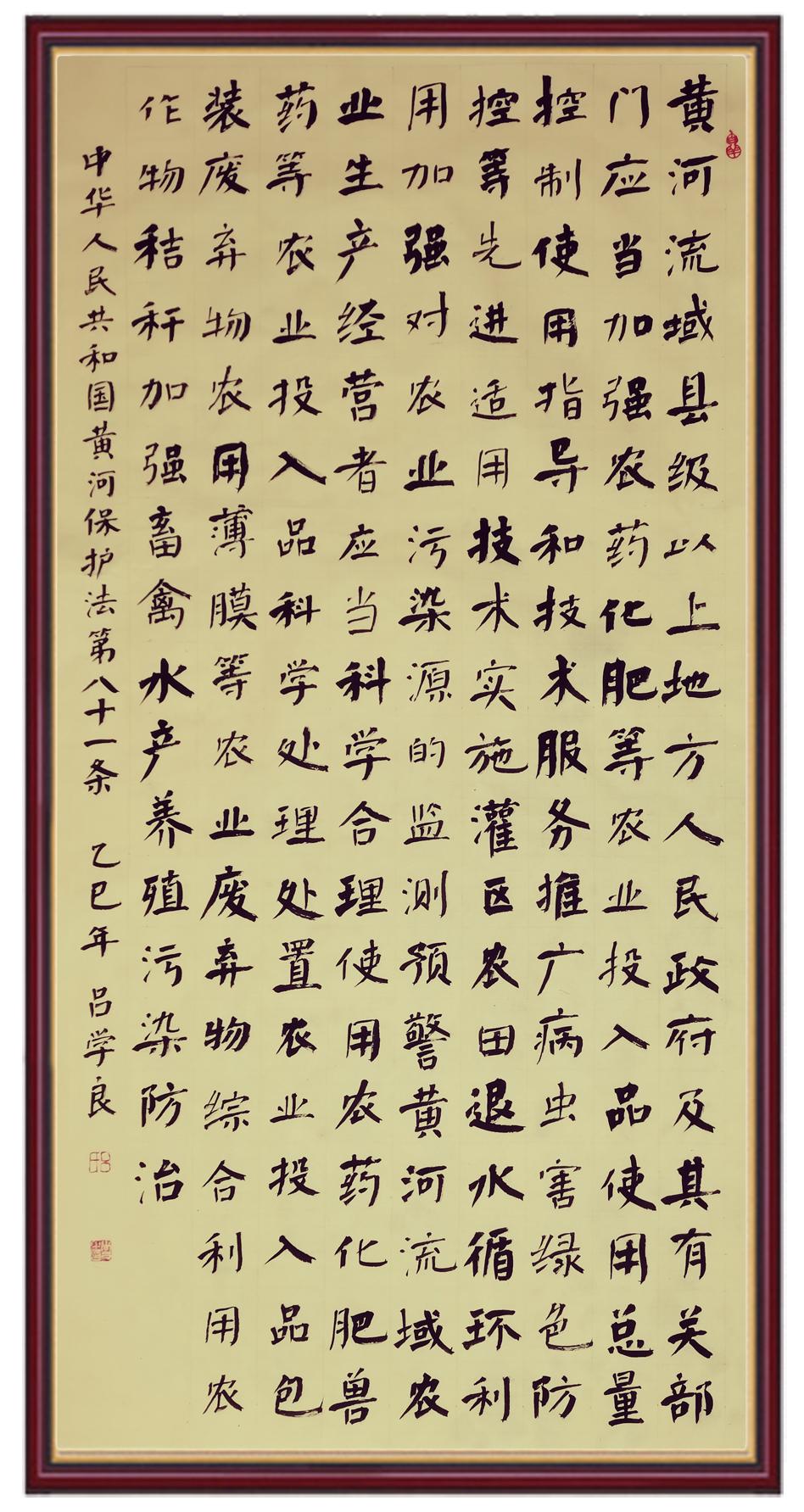 黃河寧,天下平。黃河是中華民族的發(fā)源地和搖籃,保護(hù)黃河是事關(guān)中華民族偉大復(fù)興的千秋大計?!吨腥A人民共和國黃河保護(hù)法》為推進(jìn)水資源節(jié)約集約利用、保護(hù)傳承弘揚黃河文化、推動黃河流域生態(tài)保護(hù)和高質(zhì)量發(fā)展提供了有力法治保障。繼書寫《中華人民共和國民法典》《中華人民共和國憲法》《中華人民共和國澳門特別行政區(qū)基本法》《中華人民共和國香港特別行政區(qū)基本法》《中華人民共和國國旗法》《中華人民共和國國徽法》《中華人民共和國國歌法》《中華人民共和國法官法》等法律法規(guī)之后,法制日報社聯(lián)合沿黃九省(區(qū))司法廳、書法家協(xié)會,將筆端對準(zhǔn)《中華人民共和國黃河保護(hù)法》。