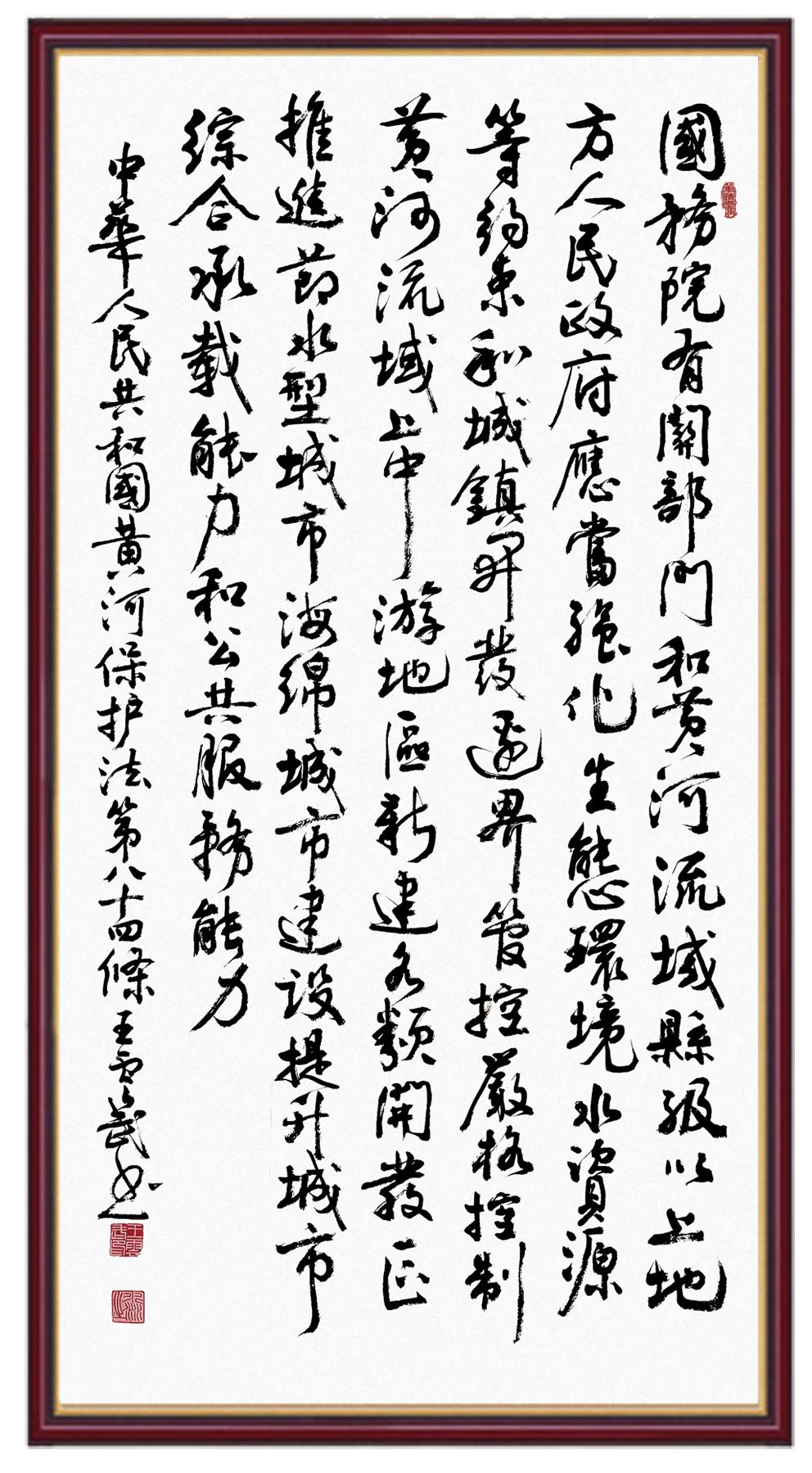 黃河寧,天下平。黃河是中華民族的發(fā)源地和搖籃,保護(hù)黃河是事關(guān)中華民族偉大復(fù)興的千秋大計(jì)?!吨腥A人民共和國(guó)黃河保護(hù)法》為推進(jìn)水資源節(jié)約集約利用、保護(hù)傳承弘揚(yáng)黃河文化、推動(dòng)黃河流域生態(tài)保護(hù)和高質(zhì)量發(fā)展提供了有力法治保障。繼書(shū)寫(xiě)《中華人民共和國(guó)民法典》《中華人民共和國(guó)憲法》《中華人民共和國(guó)澳門(mén)特別行政區(qū)基本法》《中華人民共和國(guó)香港特別行政區(qū)基本法》《中華人民共和國(guó)國(guó)旗法》《中華人民共和國(guó)國(guó)徽法》《中華人民共和國(guó)國(guó)歌法》《中華人民共和國(guó)法官法》等法律法規(guī)之后,法制日?qǐng)?bào)社聯(lián)合沿黃九?。▍^(qū))司法廳、書(shū)法家協(xié)會(huì),將筆端對(duì)準(zhǔn)《中華人民共和國(guó)黃河保護(hù)法》。