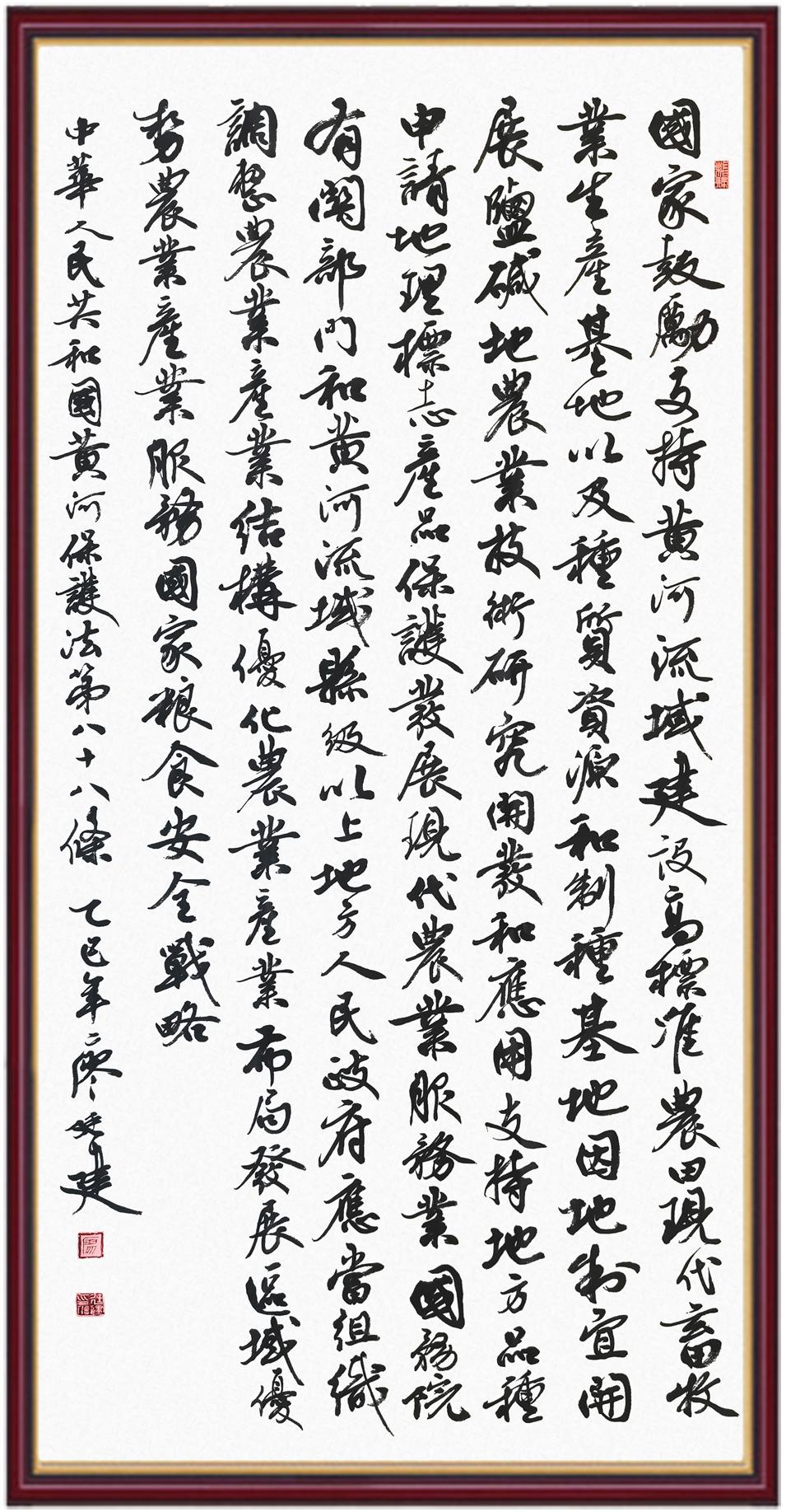 黃河寧,天下平。黃河是中華民族的發(fā)源地和搖籃,保護(hù)黃河是事關(guān)中華民族偉大復(fù)興的千秋大計(jì)?!吨腥A人民共和國(guó)黃河保護(hù)法》為推進(jìn)水資源節(jié)約集約利用、保護(hù)傳承弘揚(yáng)黃河文化、推動(dòng)黃河流域生態(tài)保護(hù)和高質(zhì)量發(fā)展提供了有力法治保障。繼書(shū)寫《中華人民共和國(guó)民法典》《中華人民共和國(guó)憲法》《中華人民共和國(guó)澳門特別行政區(qū)基本法》《中華人民共和國(guó)香港特別行政區(qū)基本法》《中華人民共和國(guó)國(guó)旗法》《中華人民共和國(guó)國(guó)徽法》《中華人民共和國(guó)國(guó)歌法》《中華人民共和國(guó)法官法》等法律法規(guī)之后,法制日?qǐng)?bào)社聯(lián)合沿黃九?。▍^(qū))司法廳、書(shū)法家協(xié)會(huì),將筆端對(duì)準(zhǔn)《中華人民共和國(guó)黃河保護(hù)法》。