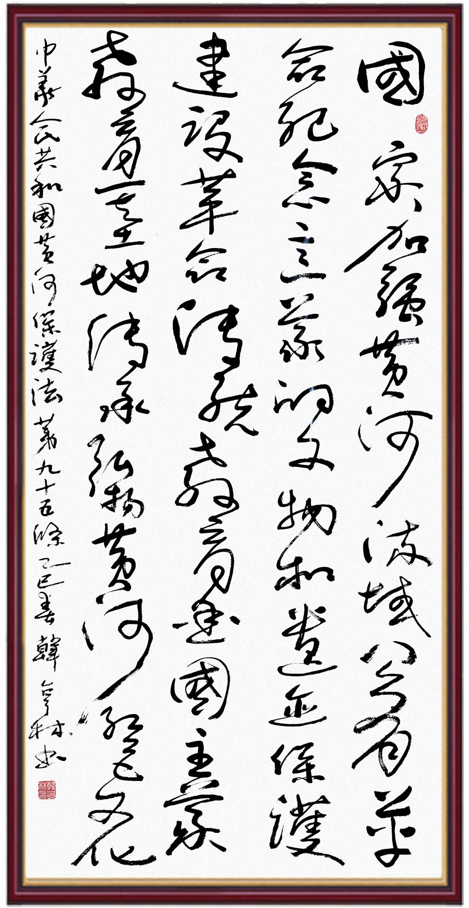 黃河寧,天下平。黃河是中華民族的發(fā)源地和搖籃,保護(hù)黃河是事關(guān)中華民族偉大復(fù)興的千秋大計(jì)?!吨腥A人民共和國黃河保護(hù)法》為推進(jìn)水資源節(jié)約集約利用、保護(hù)傳承弘揚(yáng)黃河文化、推動(dòng)黃河流域生態(tài)保護(hù)和高質(zhì)量發(fā)展提供了有力法治保障。繼書寫《中華人民共和國民法典》《中華人民共和國憲法》《中華人民共和國澳門特別行政區(qū)基本法》《中華人民共和國香港特別行政區(qū)基本法》《中華人民共和國國旗法》《中華人民共和國國徽法》《中華人民共和國國歌法》《中華人民共和國法官法》等法律法規(guī)之后,法制日?qǐng)?bào)社聯(lián)合沿黃九?。▍^(qū))司法廳、書法家協(xié)會(huì),將筆端對(duì)準(zhǔn)《中華人民共和國黃河保護(hù)法》。